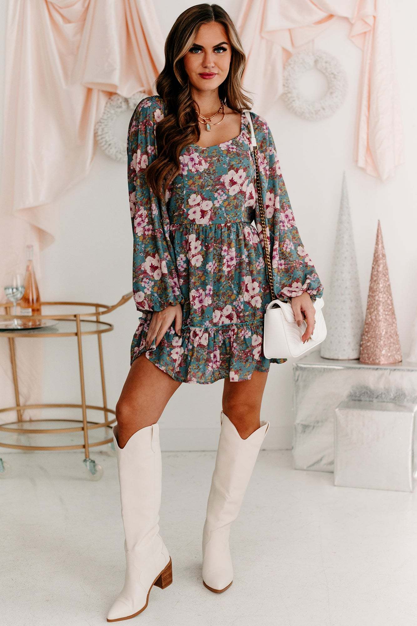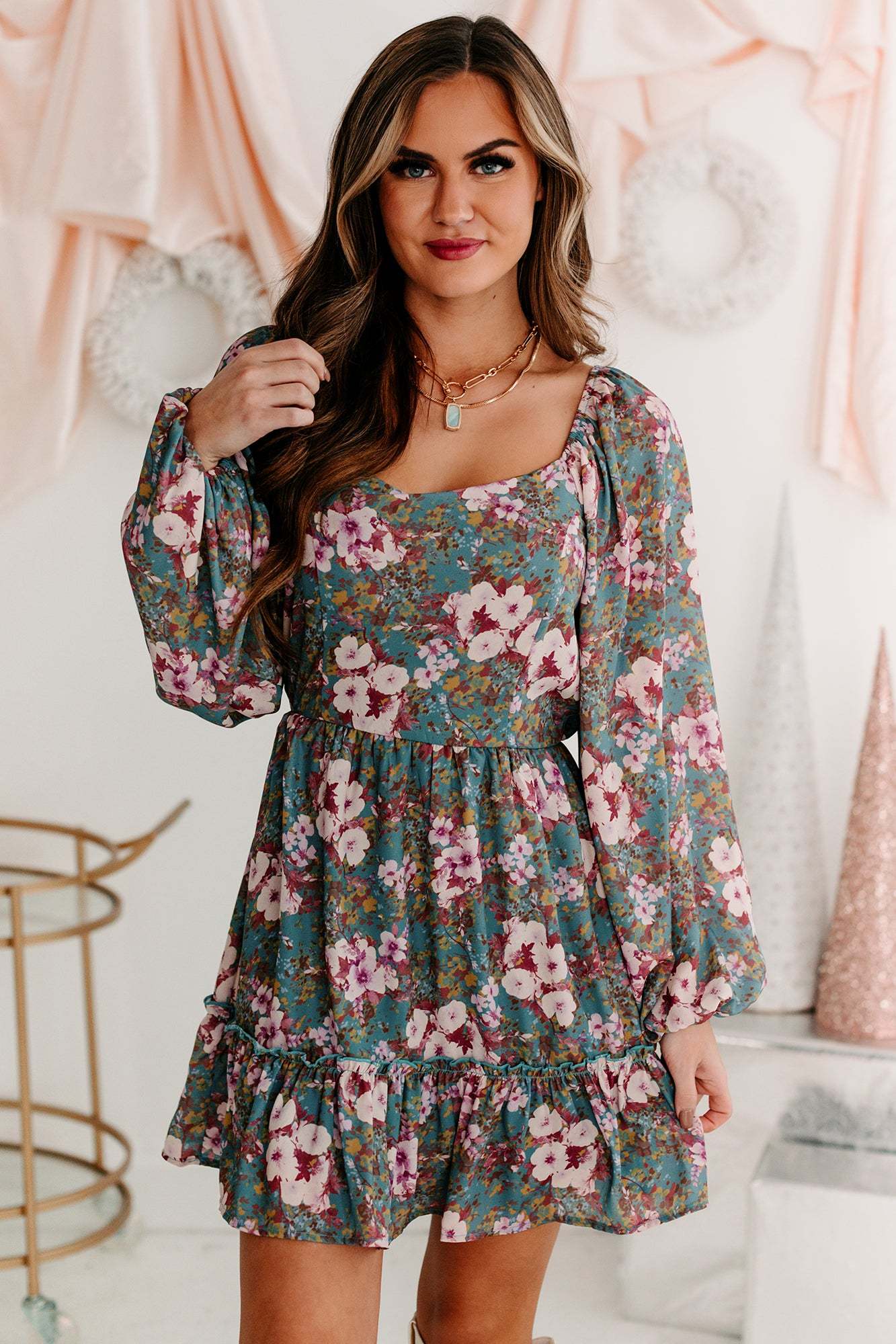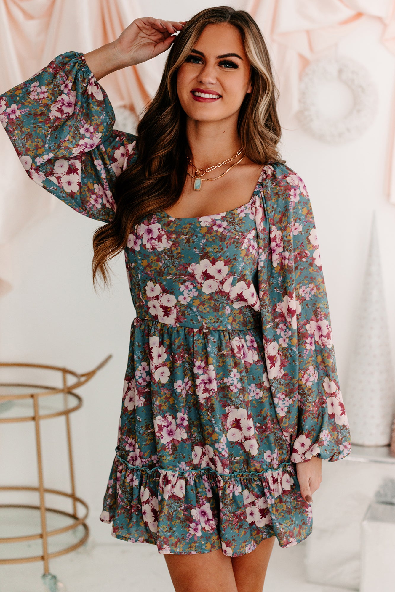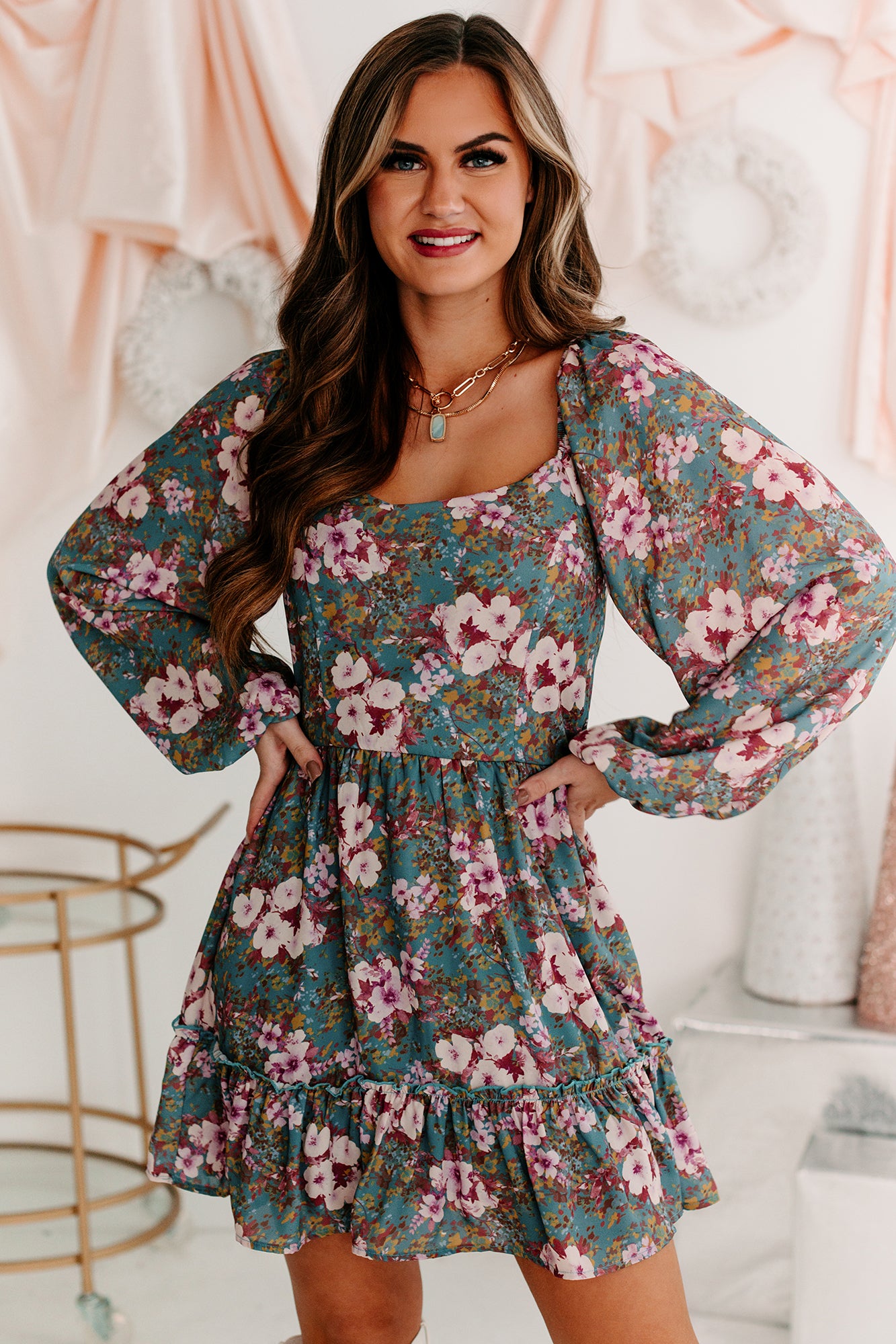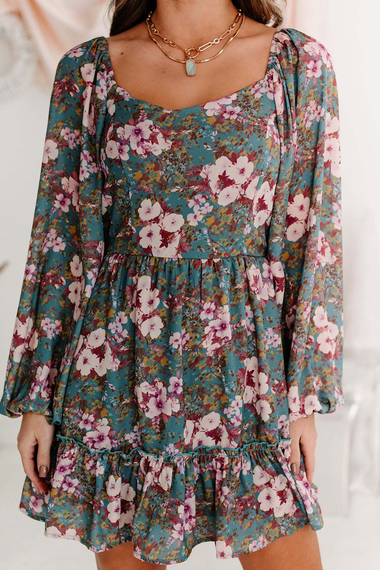 You'll Feel So Cute Wearing This Teal And Plum Floral Dress!