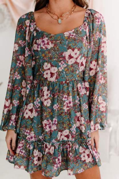 A Graceful Touch Floral Square Neck Dress (Teal/Plum)