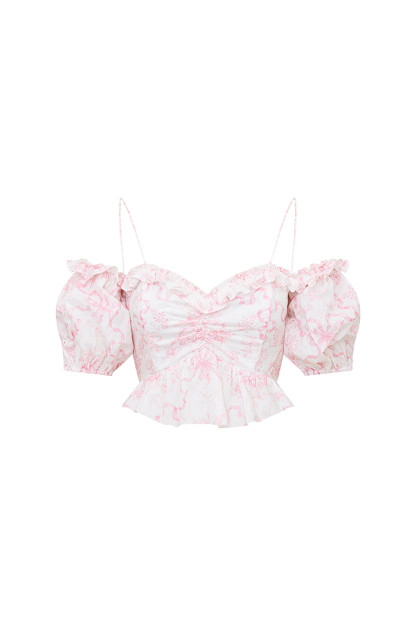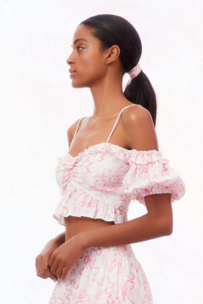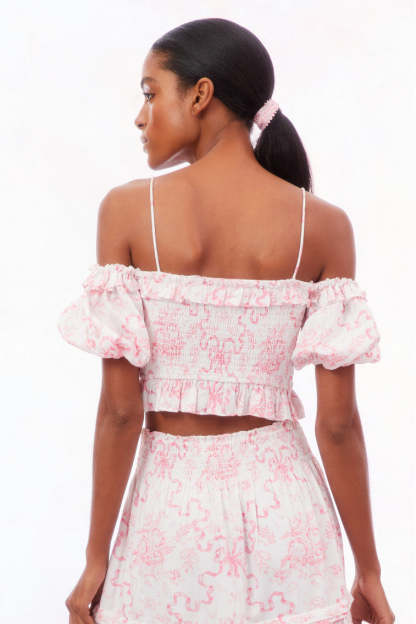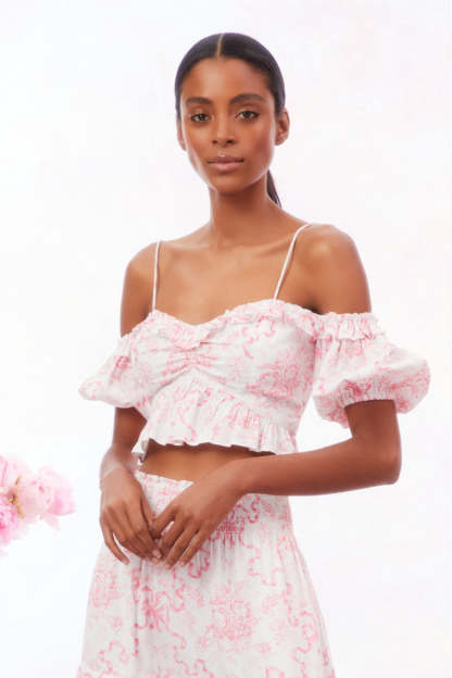 Introducing the Amille Top. Designed with a crisp linen fabric with our signature Fairytale Toile print. this off-shoulder top features charming puff sleeves with elasticized shoulders and openings. ensuring a comfortable and secure fit. The defined waistline is accentuated by gentle ruching at the center front. A delightful peplum detail adds flair to this chic piece. Pair with our Evera Skirt for a full set.