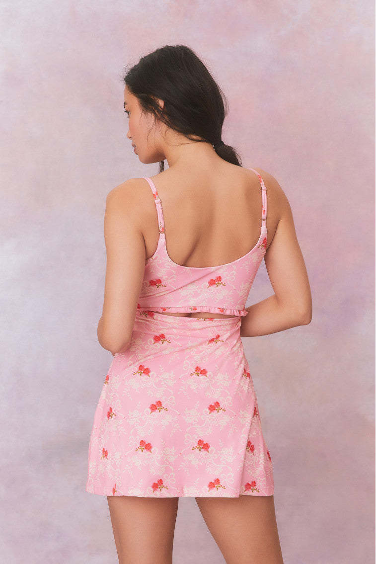 Pretty. dreamy. and ready to move in the Astoria Dress. This easy mini is designed from a lightweight. breathable fabric featuring our favorite bow and rose print and built-in shorts for the ultimate functionality. Ideal for powers walks and running errands around town.