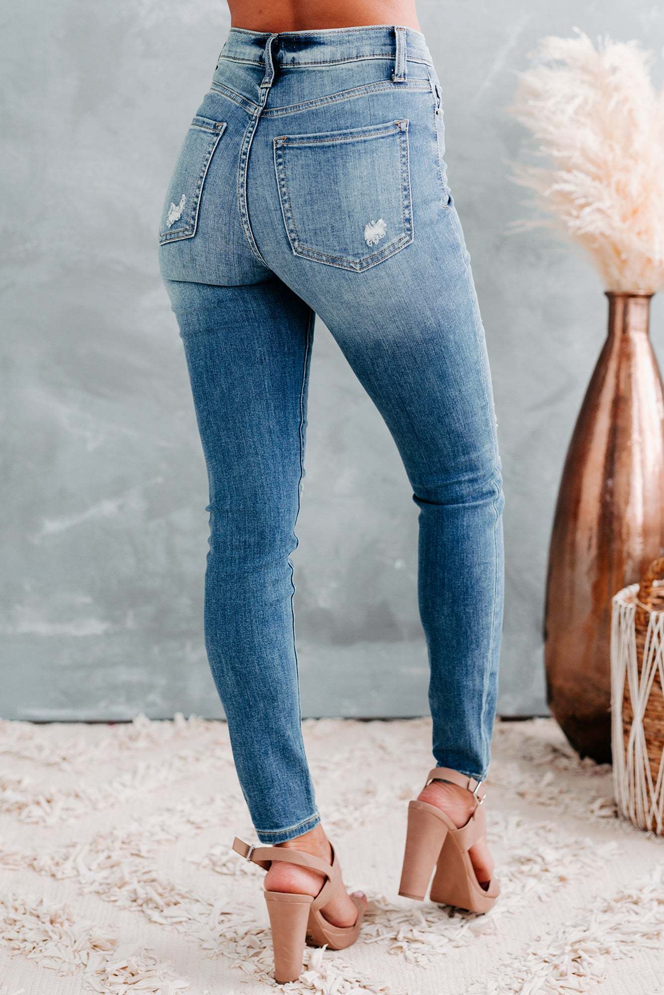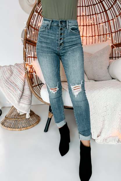 Pair All Your Favorite Sweaters With These High-Rise. 5-Button. Distressed. Skinny Jeans In Medium Light!