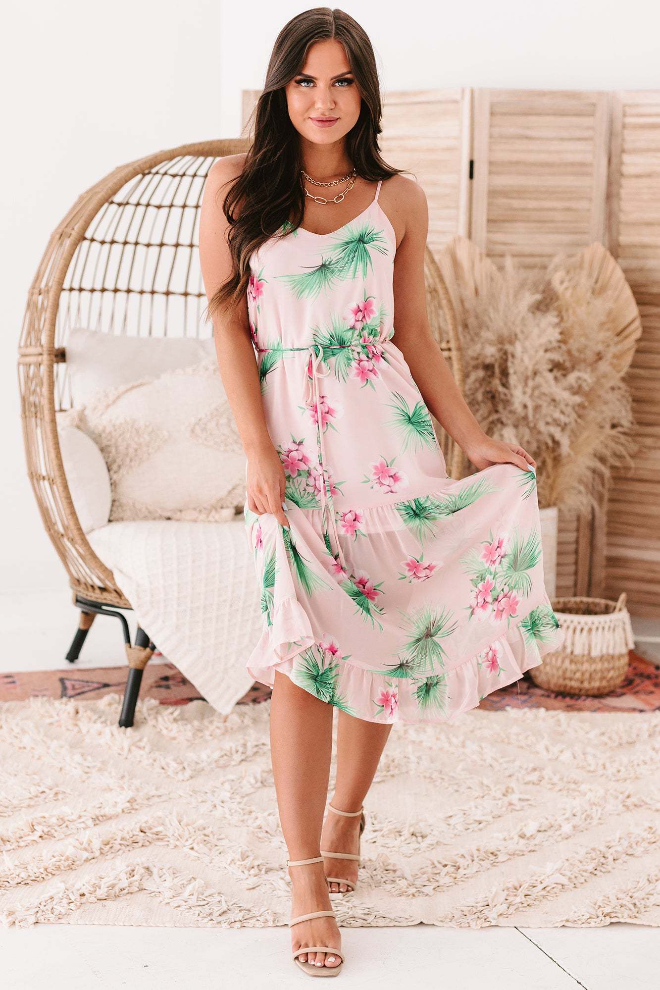 How Darling Is This Blush. Tropical Print. V-Neck. Ruffled Hem. Sleeveless. Midi Dress!