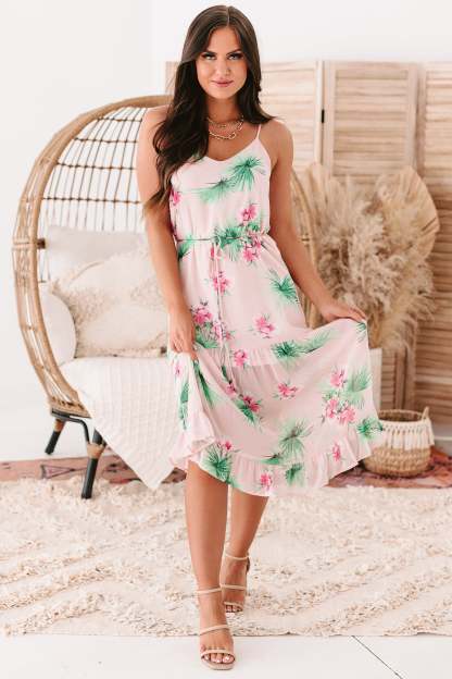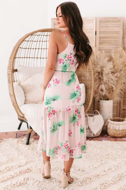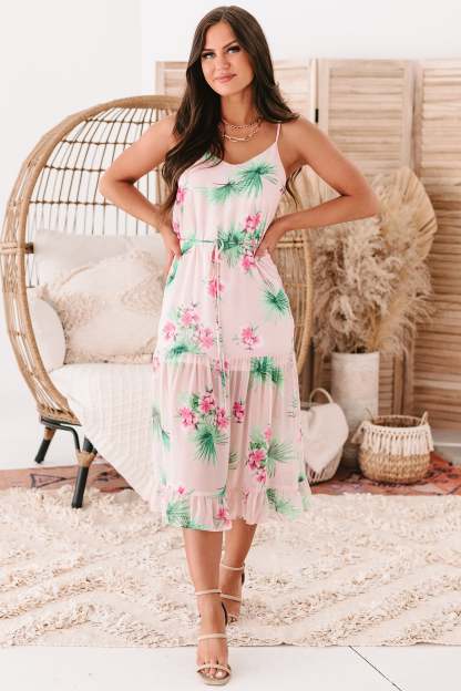 Bali Babe Tropical Print Midi Dress (Blush)