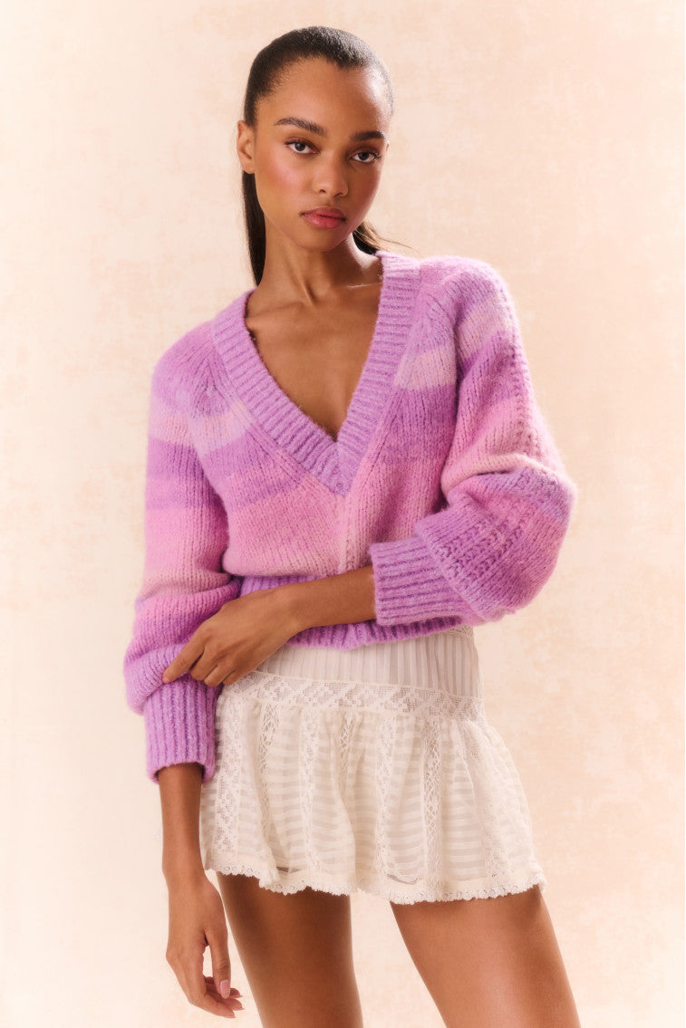 Stay warm in the Barbarelle Pullover. This playful knit is crafted from a chunky. alpaca wool blend engineered with a bayside stripe all over. Easy and cozy. the sweater reflects contrasting colors throughout. has a v-neckline. and a cropped hem.