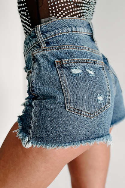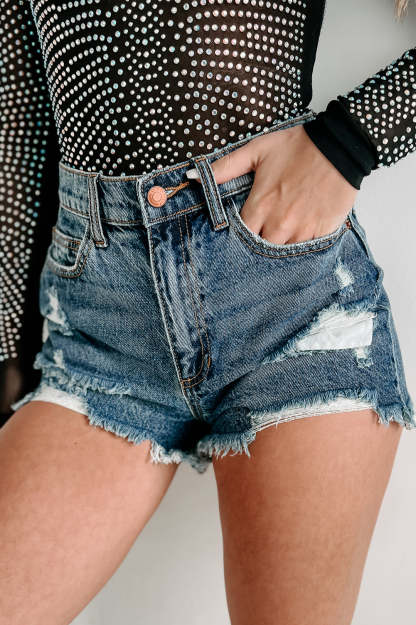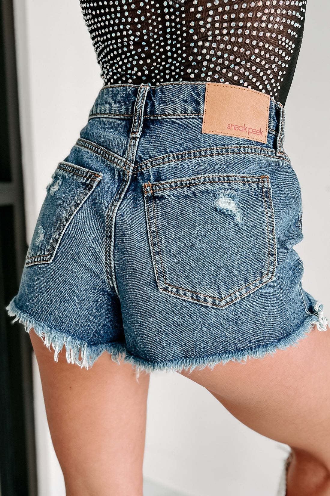 Be Honest High Rise Sneak Peek Distressed Denim Shorts (Medium Dark)