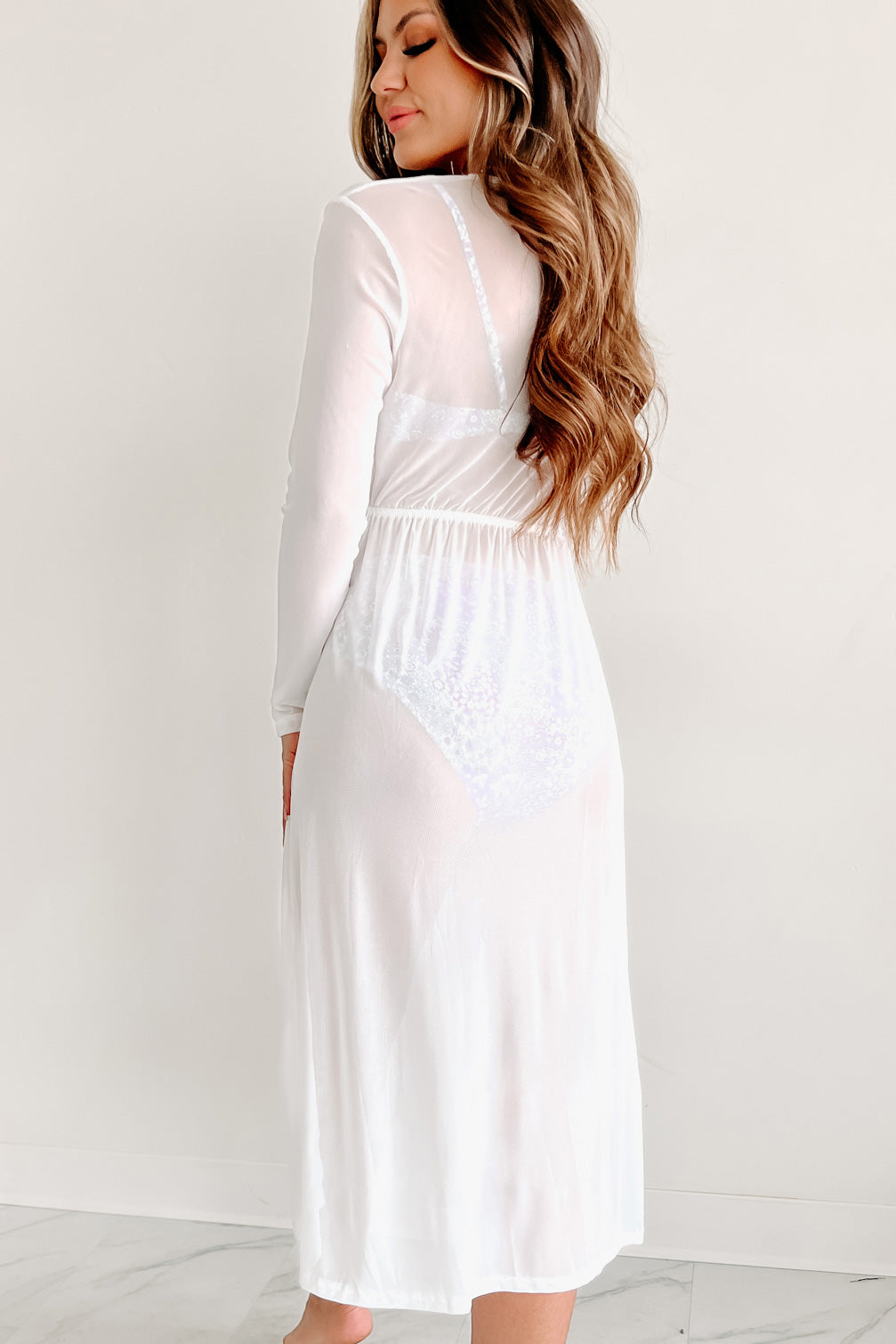 Being A Beach Babe Mesh Long Sleeve Swim Cover (White)