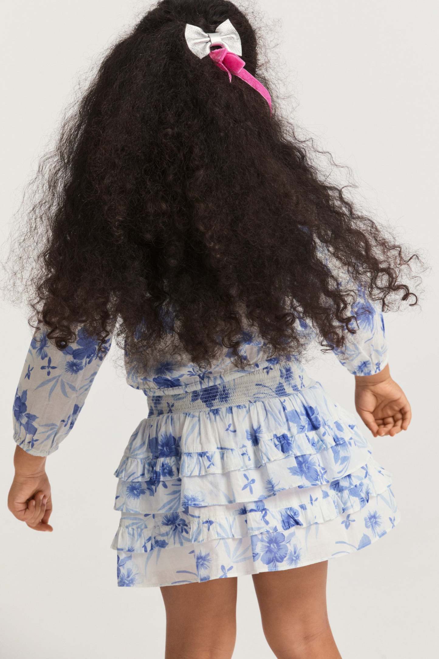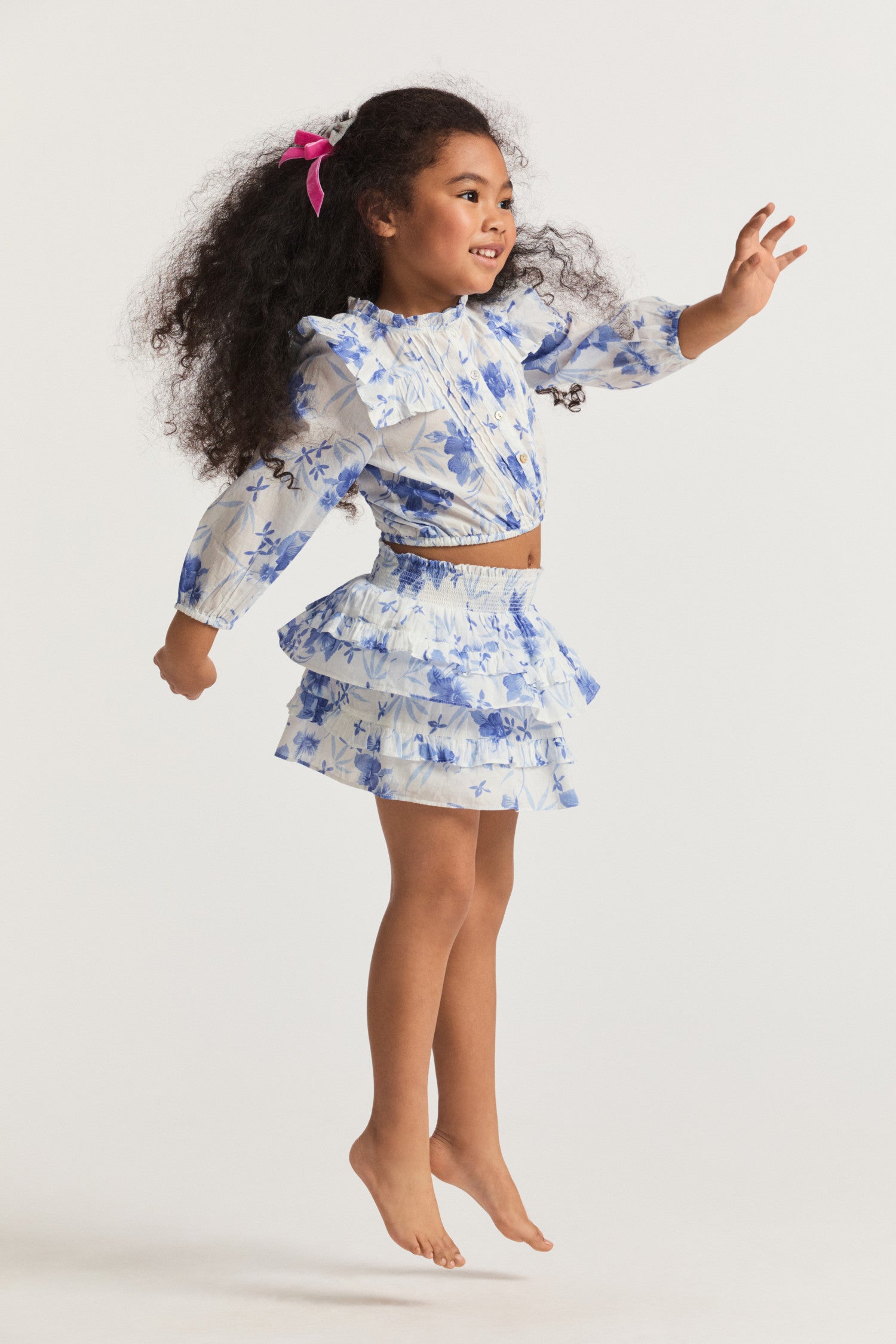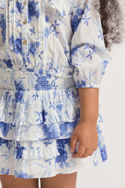 Our Billie Skirt is reimagined in 100% cotton with a hibiscus watercolor print. Below a wide smocked waistband. the skirt falls to two shirred tiers with ruffle details.