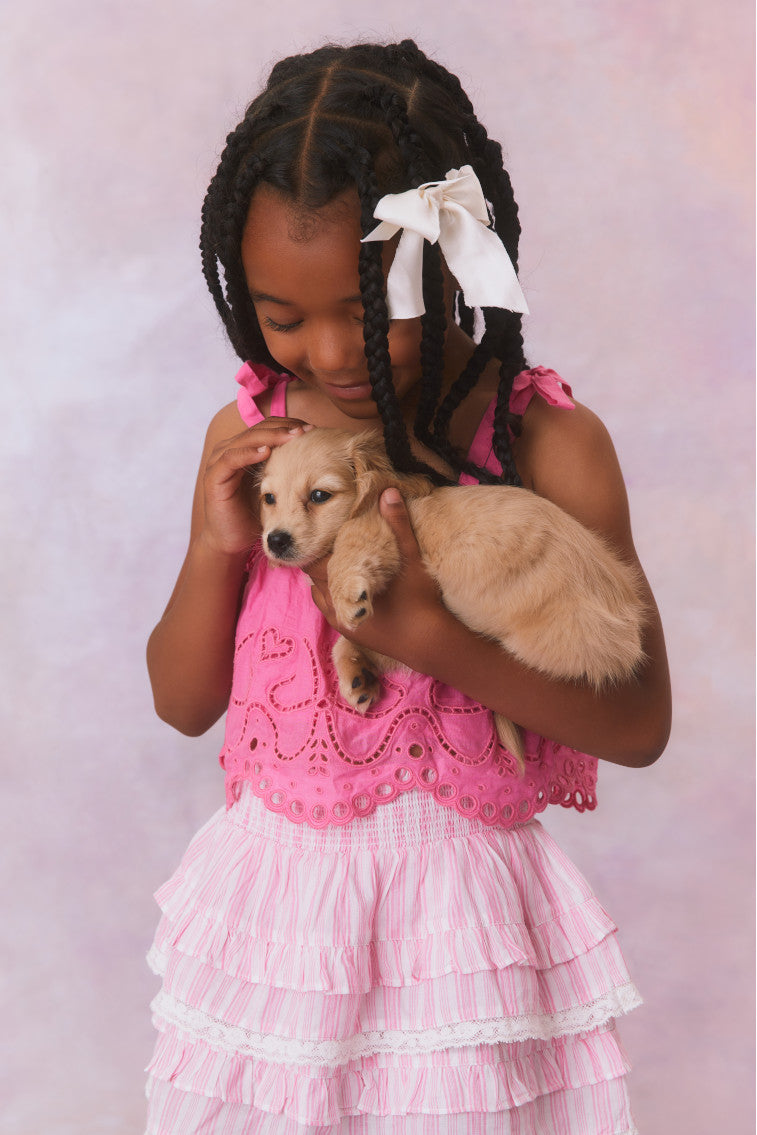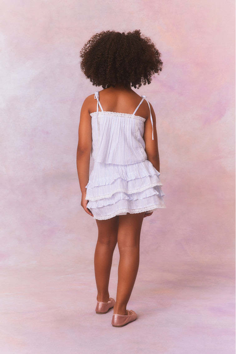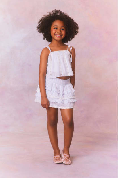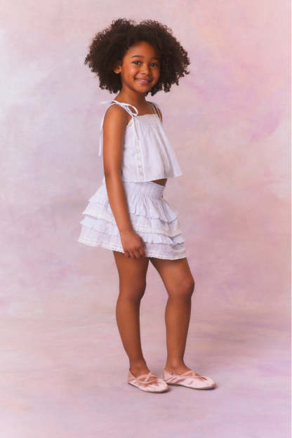 Our beloved Billie Skirt is reimagined with a soft. organic cotton fabric with blue and white printed stripes all over. Below a wide smocked waistband. the skirt falls to two shirred tiers with ruffle details.