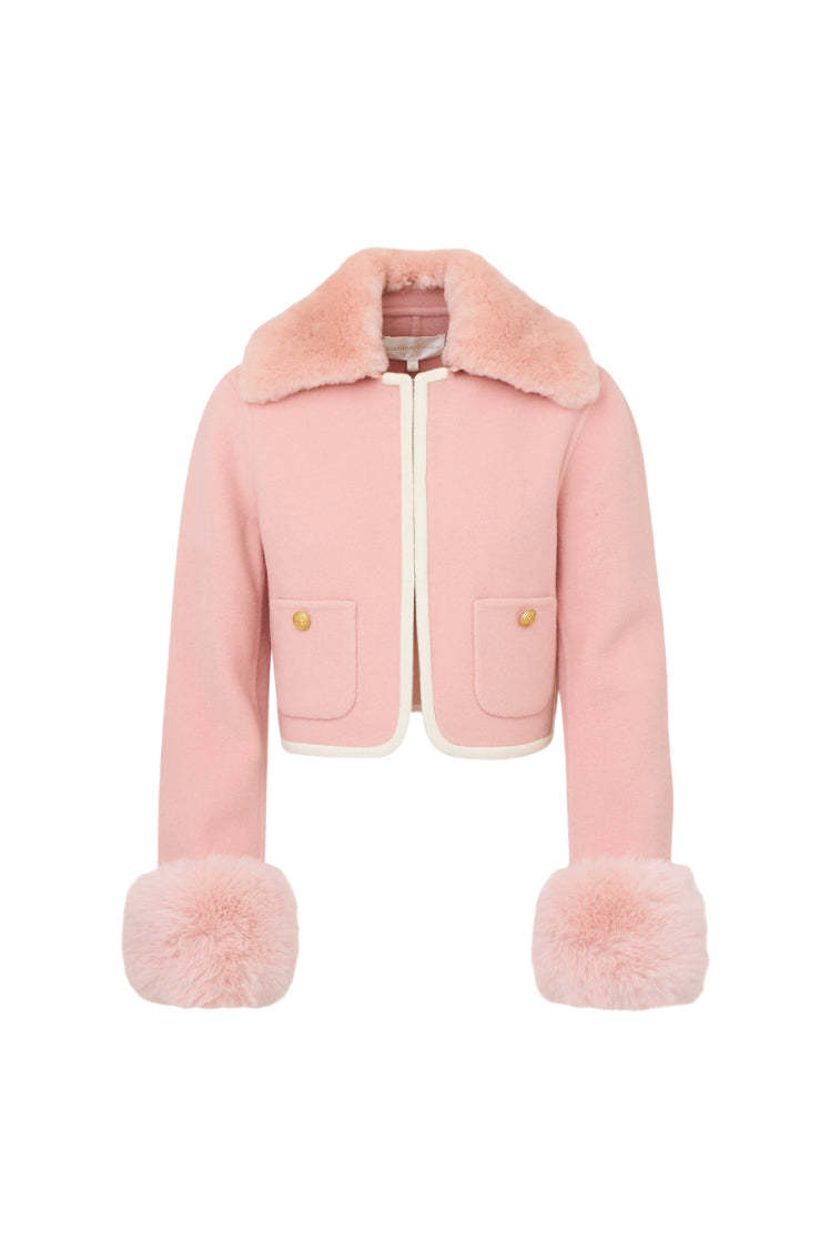 Introducing the Caprina Jacket. Designed from a soft and sustainable double face wool. this Upper East Side-inspired jacket arrives with a cozy but elevated look and feel. Contrast details. rounded pockets. and sweeped. curved edges give this layer a feminine shape. The stunning outerwear gets a playful touch with faux fur on the collar and cuffs.