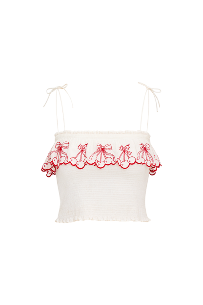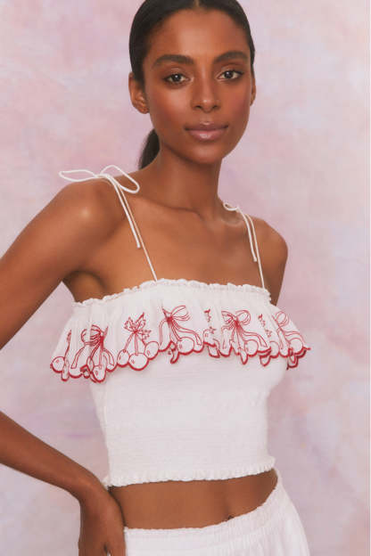 Extra sweet in the Carletta Top. Designed from organic cotton fabric. this vintage-inspired piece debuts with flirty. scalloped cherry embroideries as a ruffle on the square neckline. The top features thin spaghetti straps with a self tie detail and a smocked bodice. Pair with the Amparo Skirt for a full set.