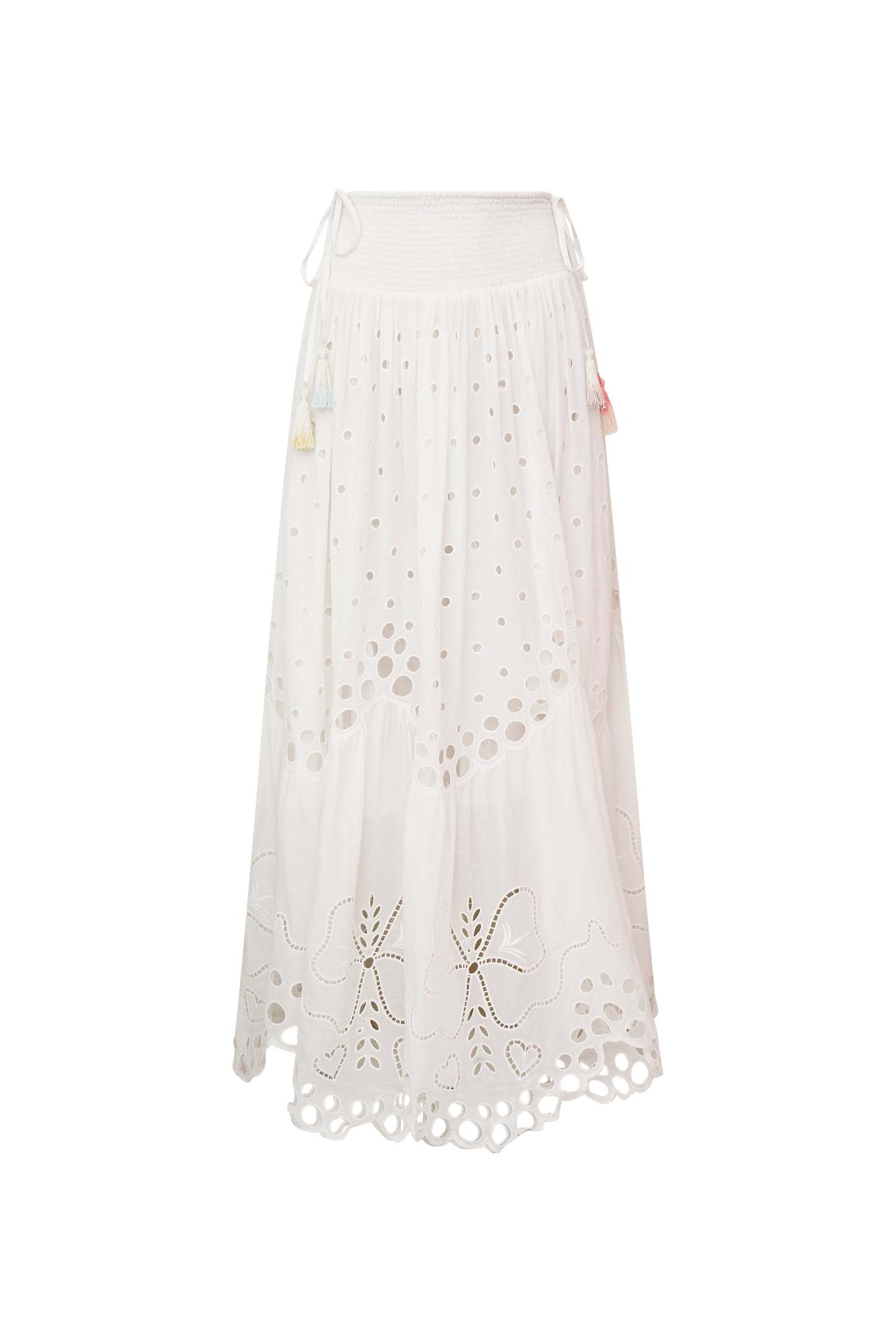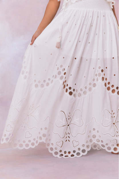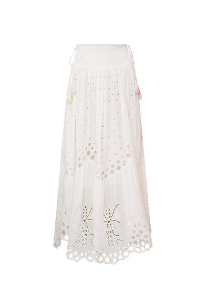 Sunshine chic in the Cassaro Skirt. This bohemian-inspired maxi skirt embodies effortless elegance and summer charm featuring a smocked elastic waist for a comfortable fit. with functional drawcords adorned with dip-dyed tassels in vibrant colors at the sides. Crafted with circular eyelet details and a scalloped full eyelet hem. the pieces offers a light and airy feel perfect for warm weather. Its sweepy silhouette flows gracefully. enhanced by custom bow eyelet details at the bottom for a unique touch.