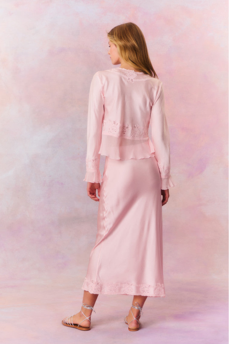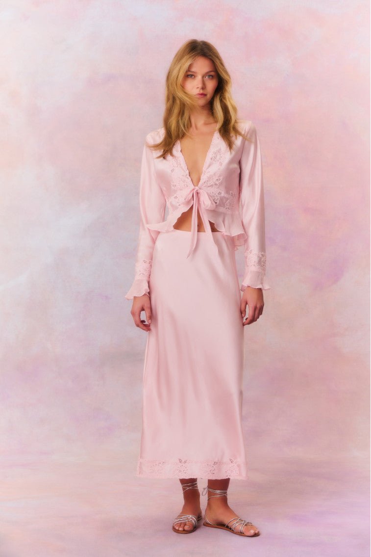 Easy and dreamy the Castle Skirt returns for the summer with a soft silk charmeuse fabric. The easy slip skirt features an elastic waistband for easy wear before falling to the flirty. rhinestone-embroidered hem at the sweep.