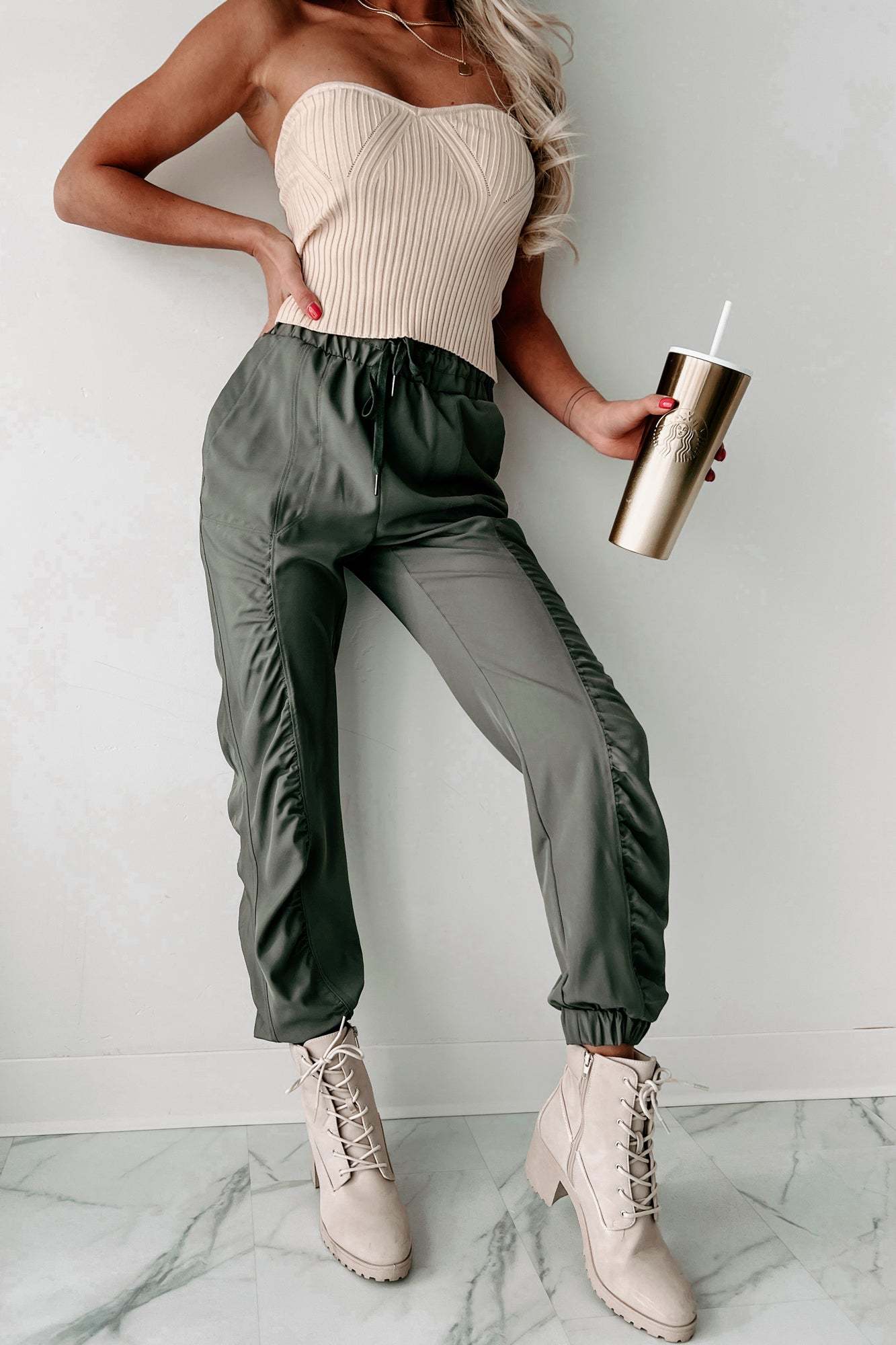 STEP OUT IN A LOOK THAT'S SURE TO TURN HEADS WITH THESE UNIQUE. OLIVE JOGGER PANTS! FEATURING AN ELASTIC WAISTBAND WITH AN ADJUSTABLE DRAWSTRING. YOU'LL LOVE THE RUCHED SIDES AND THE EXTRA TOUCH OF PERSONALITY FROM THE ELASTIC HEMS - GO AHEAD. SHOW OFF YOUR STYLE!