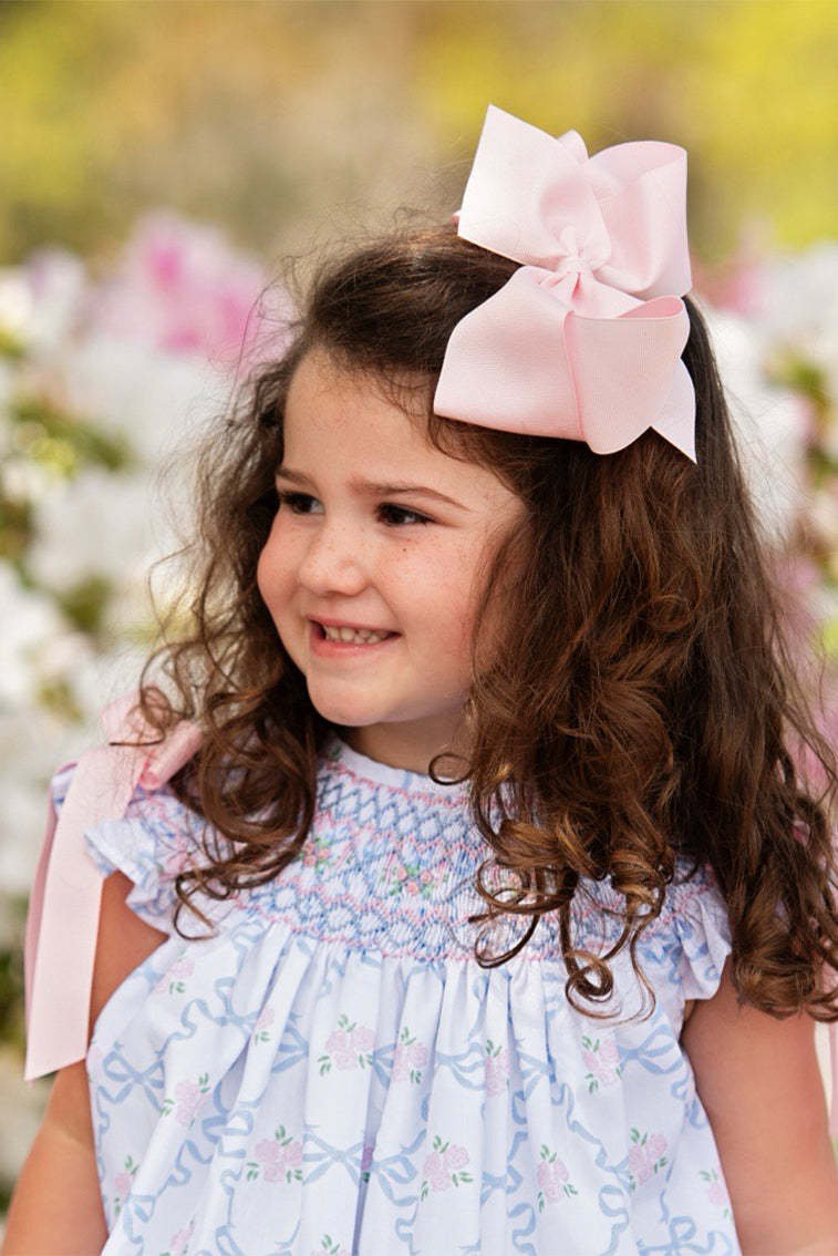 She is sure to dazzle in this sweet dress that features darling bouquets of soft pink roses. nestled among beautiful streaming blue ribbons. Exquisite geometric hand smocking includes petite rosebuds to mimic the gorgeous soft floral pattern. Add feminine flutter sleeves adorned with the prettiest pink grosgrain bows and you have a breathtaking dress that she will be absolutely stunning in.