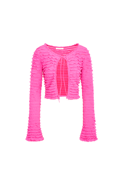 Introducing the Celosia Cardigan. This pretty in pink knit is designed from a gauzy. lightweight fabric featuring tiny ruffles all over creating a playful texture. With a slim fit. the long sleeve top has flared cuffs. a self tie at center front leaving an airy. flirty opening. and a center front placket finished with tiny ruffles along the edge. Pair with our Macaw Skirt for a full set.