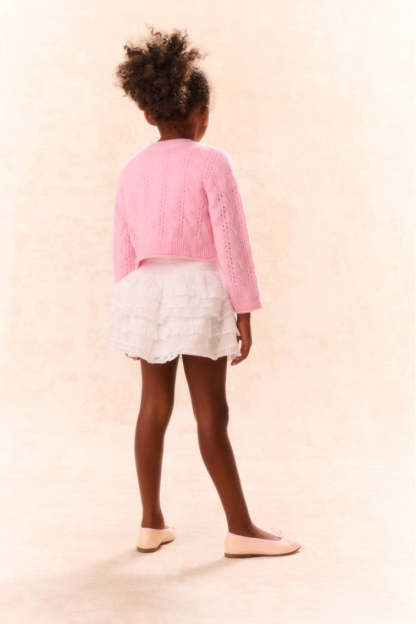 Our girls are extra cozy in the Constine Cardigan. This charming knit features a stunning pointelle detail and easy buttons down center front.
