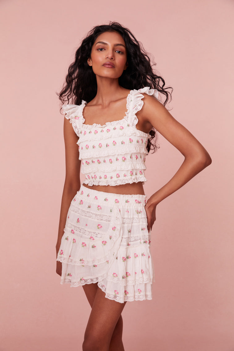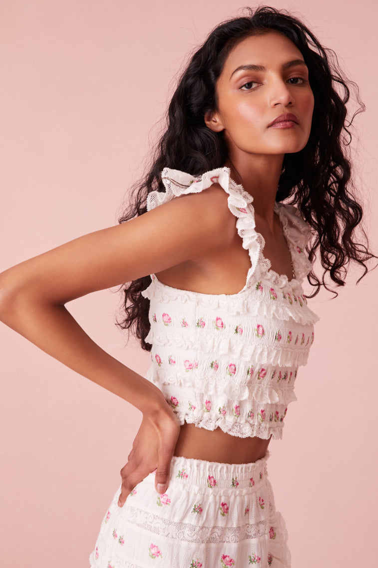 Feeling springtime chic in the Cordula Top. This easy piece features a soft. cotton striped dobby fabric with slight texture. Embroidered with small pink roses. the piece begins with tiny flutter sleeves with elastic at the shoulders above a square neckline. Smocked all over. the top includes charming lace and ruffle details throughout and stops at the natural waist.