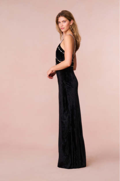 Effortlessly chic in the Corrino Dress. This lovely. bias cut slip gown is designed from a luxe. velvet fabric featuring hand-applied rhinestones and crystals along the top and the spaghetti straps. The body-skimming maxi dress begins with a deep v-neckline that descends to an empire waist which falls to an ever-flowing skirt. Wear to your next event or night out on the town.