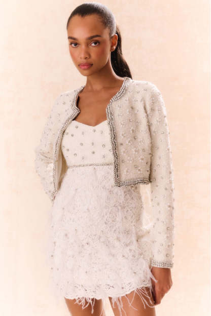 Introducing the Cosmos Jacket. The gorgeous and iridescent layer makes its entrance as part of our artisanal group of the season featuring stunning intricacies and details like hand-beaded tiny pearls. seed beads. and floral-shaped pearls studded with rhinestones. This incredible. evening wear jacket hits at the waist with a cropped silhouette. slim-fitting sleeves. and a rhinestone lining at the sleeves. neck. and waist. Pair with our Brianne Dress for a coordinating moment or wear over your favorite vintage jeans.