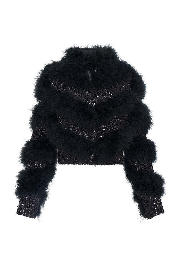 Winter chic in the Curran Jacket. This dreamy outerwear is designed with a beautiful sequin tweed shell with layered bands of soft feathers. This holiday statement piece has a flattering silhouette that hits at the waistline. comes fully lined. and includes a hook and eye closure on the interior. Pair with your favorite vintage jeans or mini for a full look. The jacket comes fully lined.