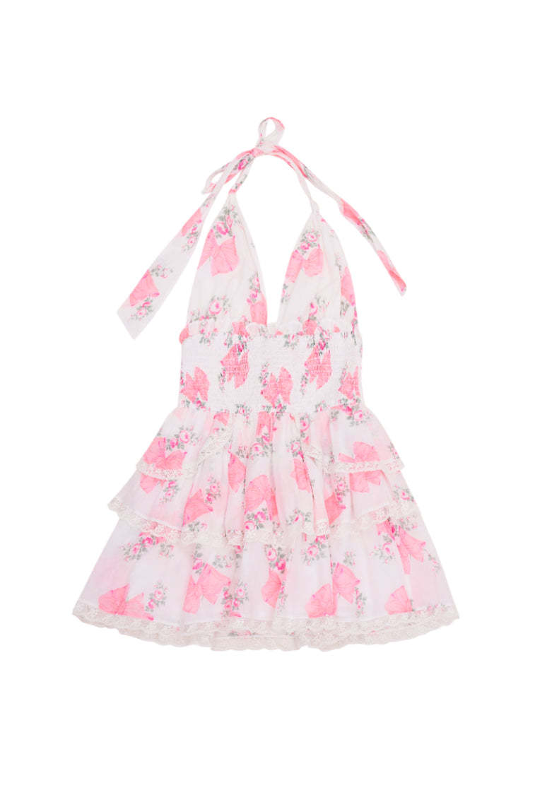 Everyone's favorite Deanna Halter Dress returns with our beloved. Rosa Beaux print – our original. signature oversized bow. This low-cut convertible halter ties in a generous bow at the neck and can be crossed at front. Below a wide smocked waistband. the skirt flares to smaller details at the hips and two ruffled tiers.