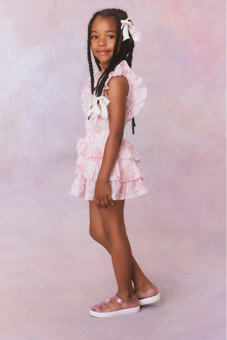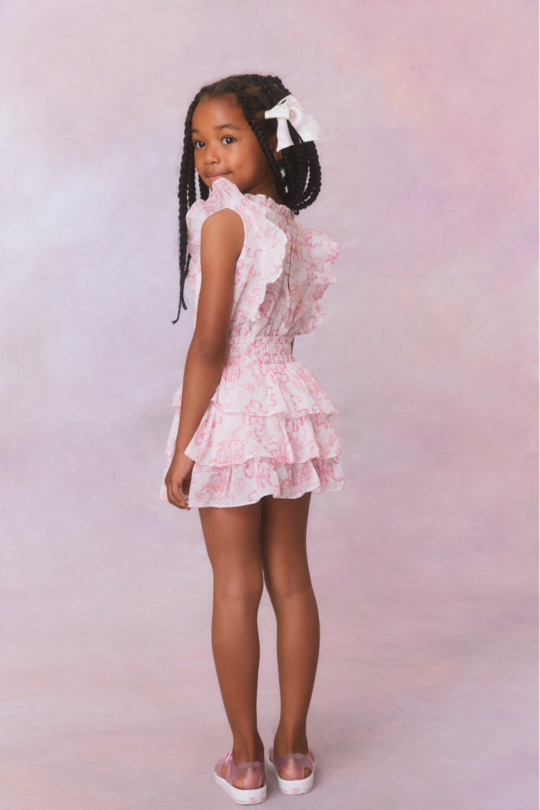Our Decker Dress is reimagined for our darling littles in cotton with our Fairytale Toile print. This easy frock has a ruffle-trimmed collar. buttons down center front. flutter sleeves. an elastic waist and overlapping asymmetrical ruffles at the skirt.