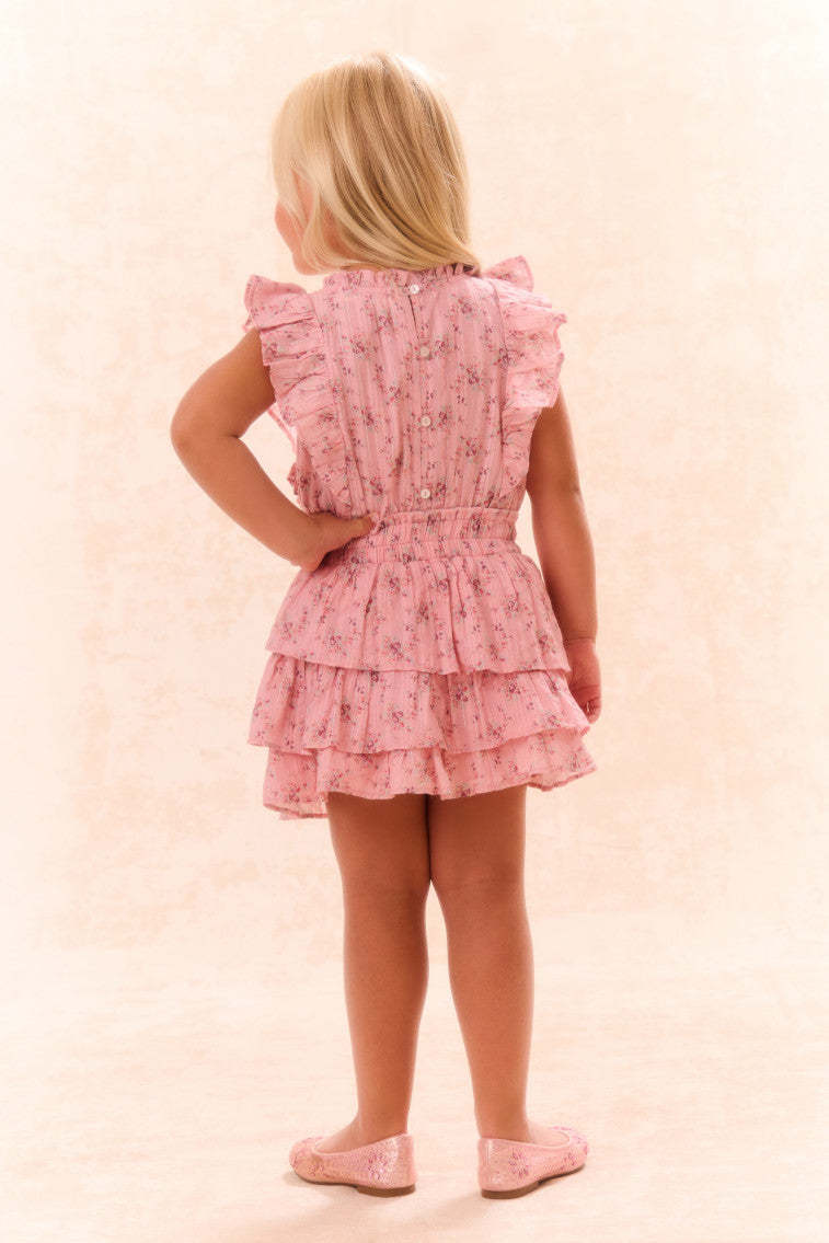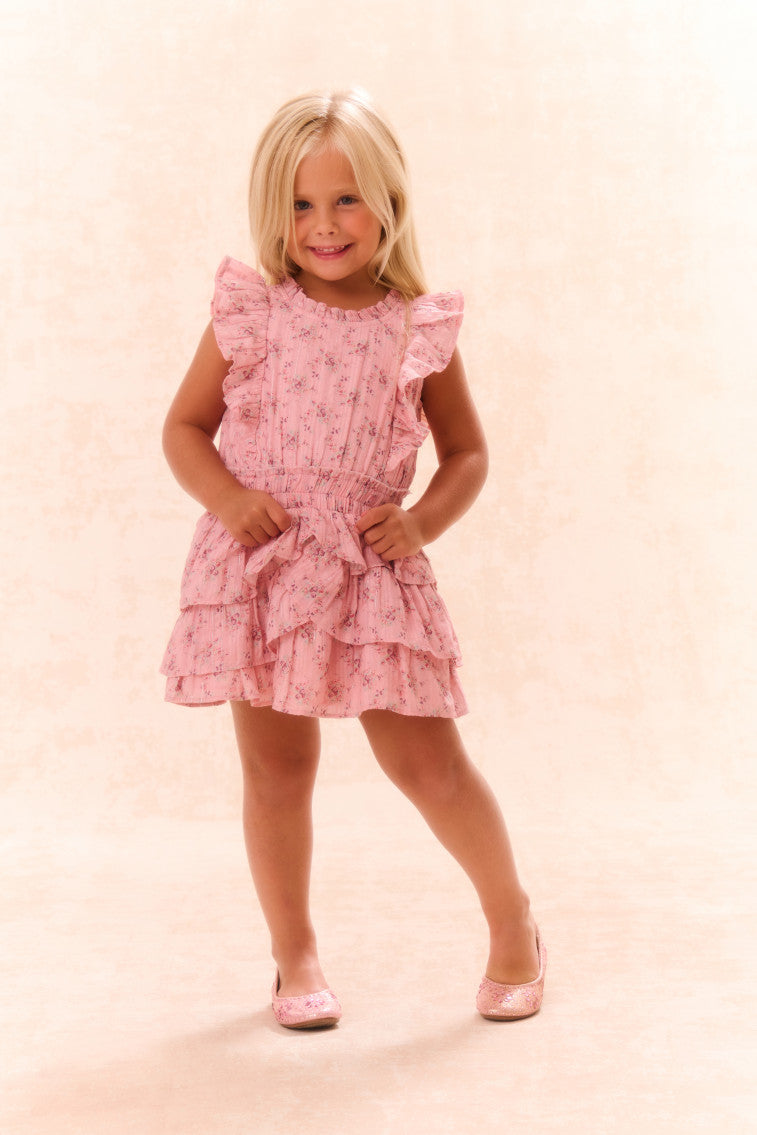 Our Decker Dress is reimagined for our littles in cotton. This easy frock has a ruffle-trimmed collar. buttons down center front. flutter sleeves. an elastic waist and overlapping asymmetrical ruffles at the skirt.