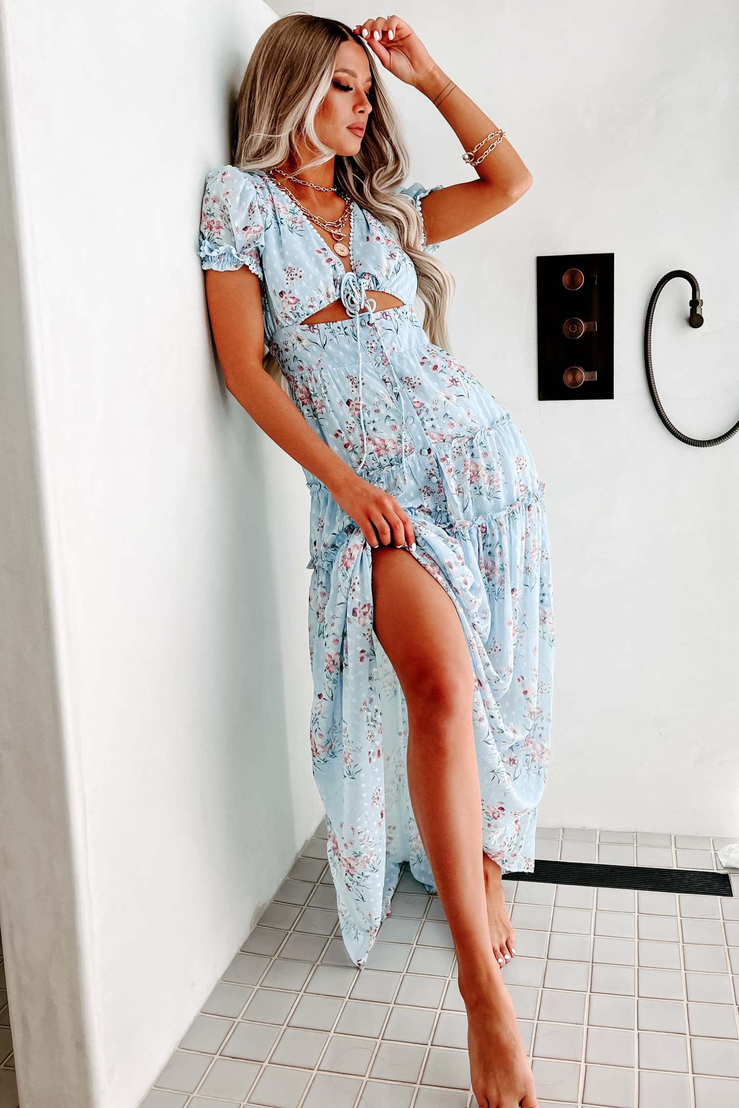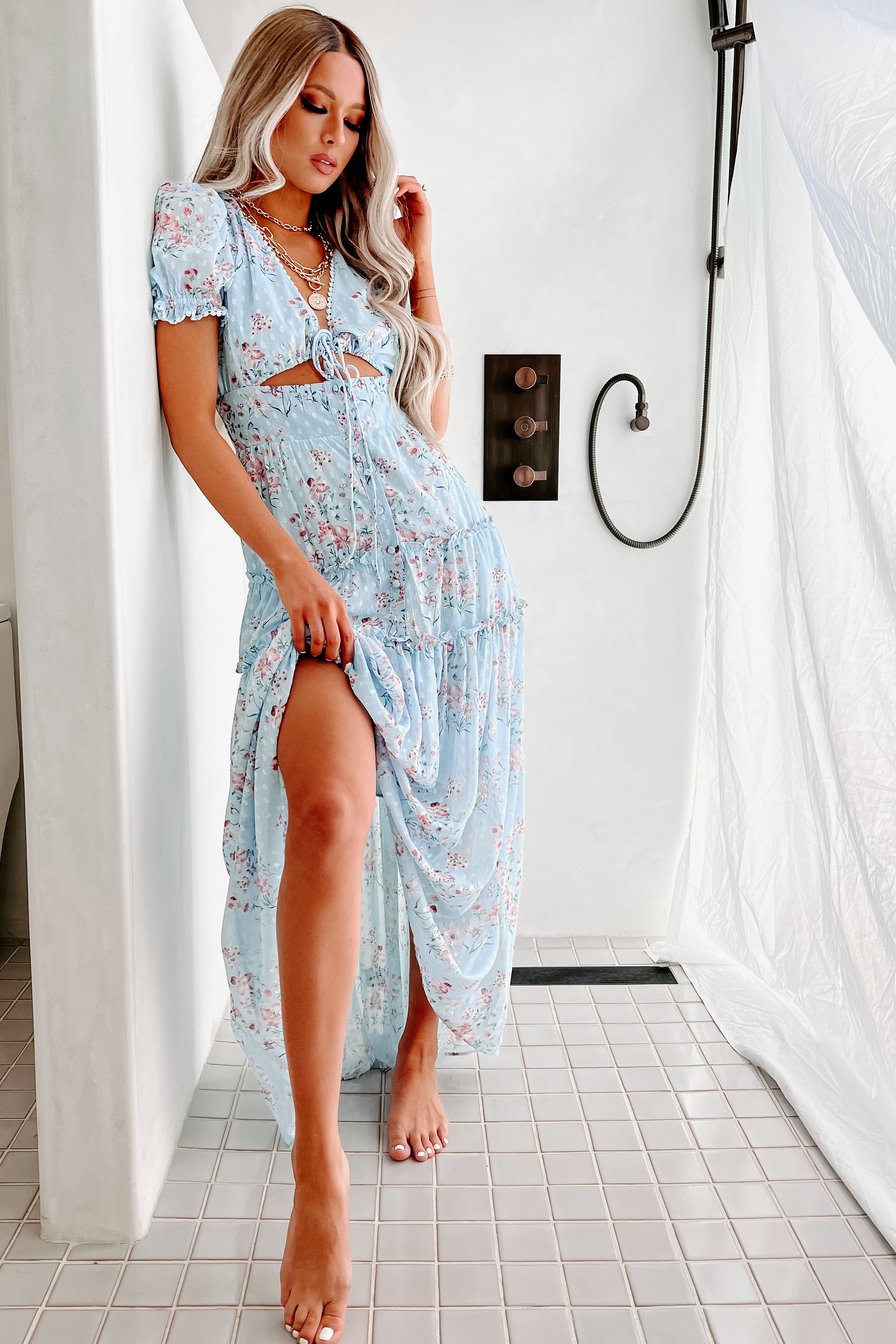 This Blue. Floral Maxi With Puff Sleeves. A Cut-Out Front. & A Tiered. Ruffle Skirt Is So Girly!