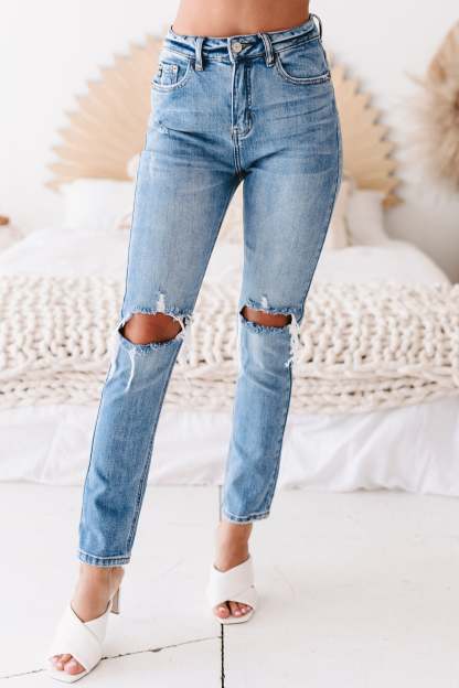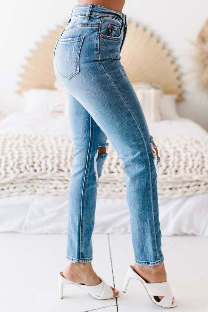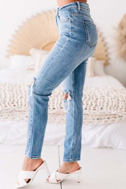 Add These Medium Wash. High Rise. Distressed. Slim Straight Jeans!