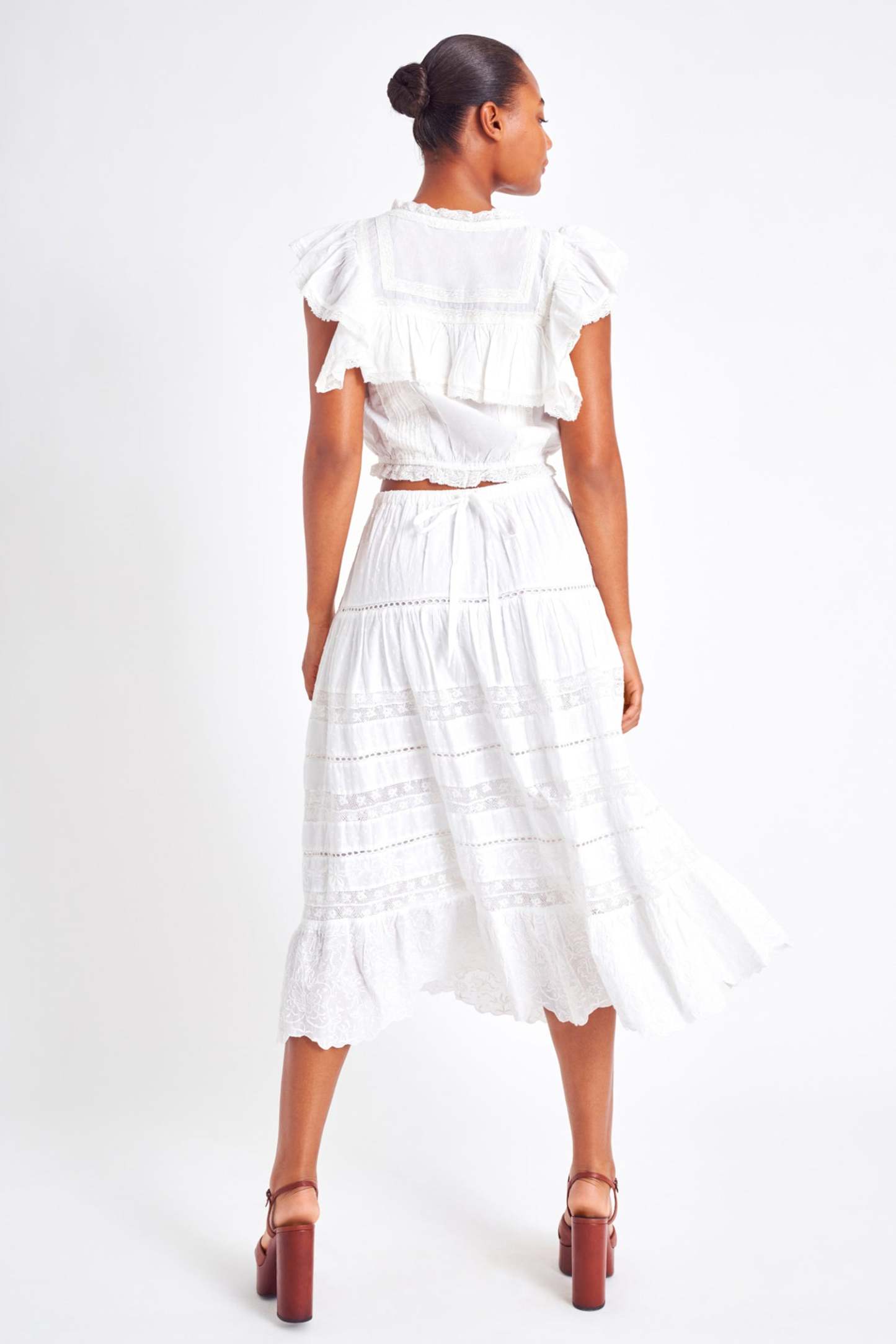 Our new Donna Skirt sashays in with inset floral lace and lofty wildflower embroidery on custom dobby cotton. A functional drawcord at the waist can be tied in a bow at front or back. Below. the full sweep. midi-skirt drops into shirred panels and a final embroidered flounce at bottom.
