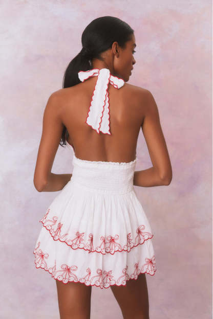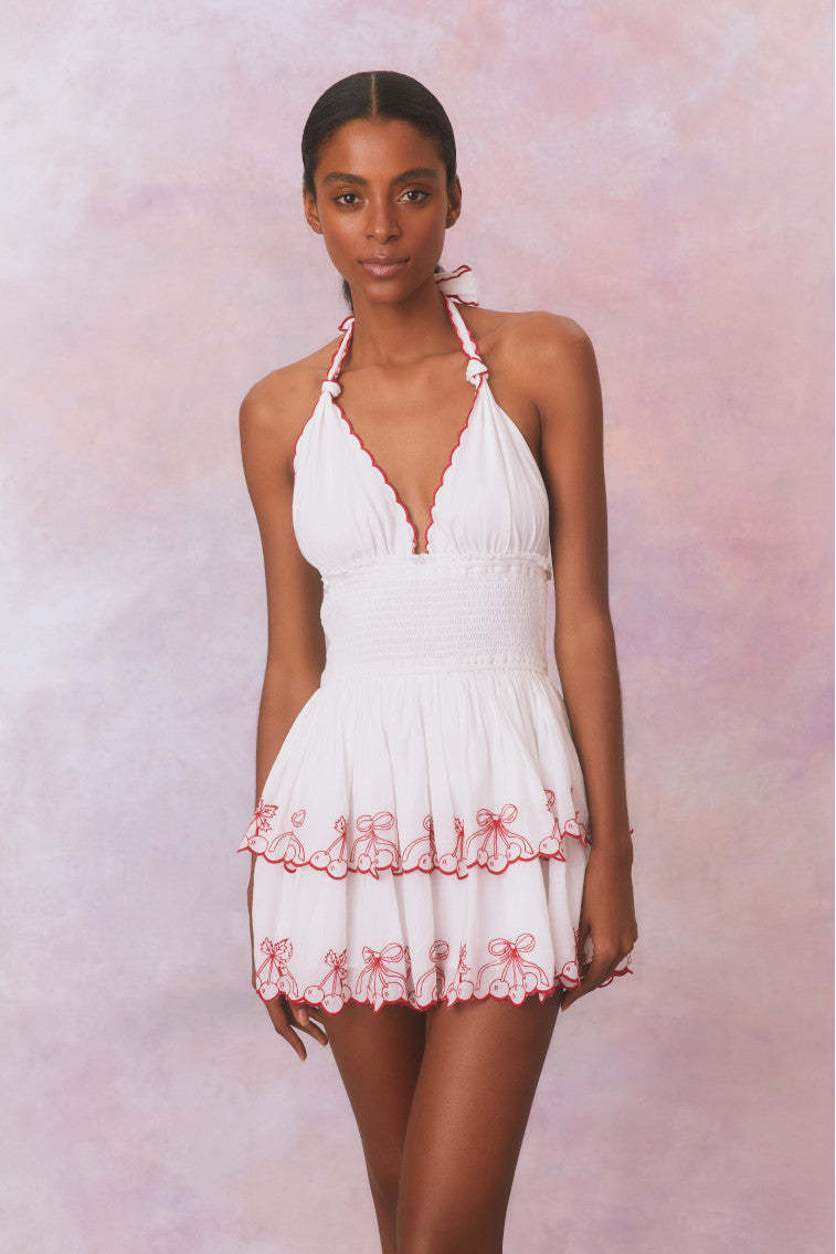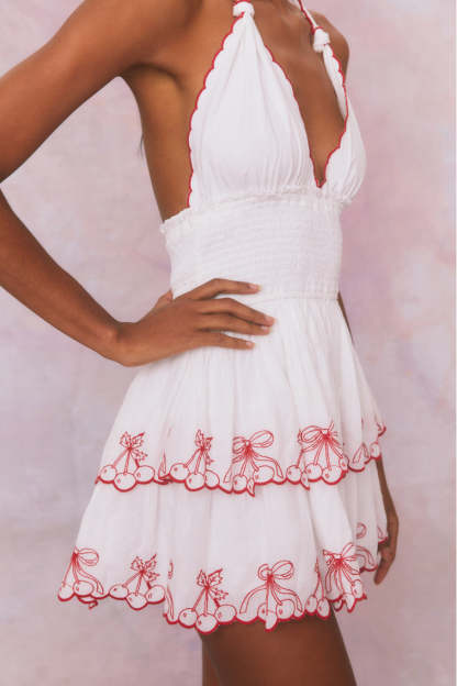 Introducing the Dormina Dress. Extra sweet. this dreamy mini debuts with a 100% organic cotton fabric featuring scalloped cherry embroidery details on the tiers of the skirt and contrasting scallop detail lining the halter neckline. A sister to our Deanna Dress. the must-have dress has a smocked bodice and two-tiered. airy skirt.