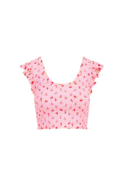 Introducing the Dovi Top. This top features flattering smocking throughout the body. gently cinching for a defined silhouette. Delicate ruffles adorn the neckline and sleeves. adding a touch of romance and whimsy. Designed with a shorter fit. the pretty top features our new ditsy rose print all over.