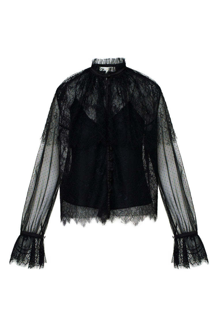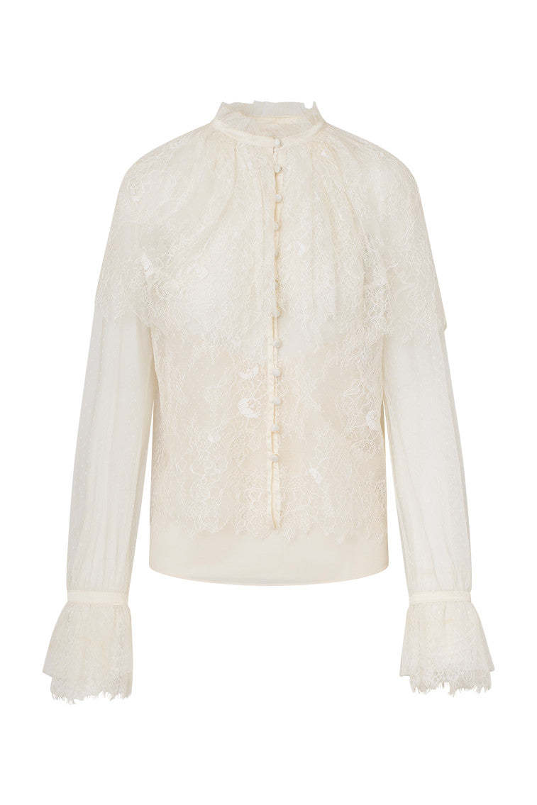 Introducing the Duquette Top. Elegant and sophisticated. this Bohemian-inspired ruffle blouse stuns with our delicate chantilly lace all over. The piece begins with a high neckline with a ruffle collar while a charming cape-like detail drapes around the shoulders. With a generous yet straight fit. the flows on with kong. sheer sleeves. self-covered buttons down center front. and a removable crepe de cinch cami top underneath. This top can be worn open or close depending on the wearer's desire.