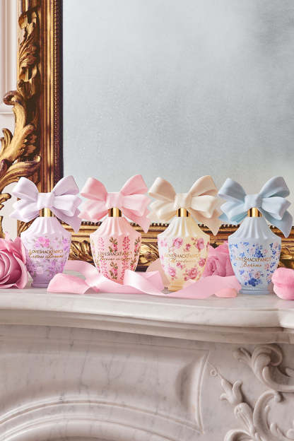 An oversized bow. perfectly imperfect. The OhMollys perfume bottle references founder Rebecca Hessel Cohen's life long love of bows and ribbons with a sculptural bow top that appears tied and tightened by hand. The Happy Thoughts print is a signature design chosen from over 2.000 in the OhMollys print and lace library to decorate the pale berry-colored bottle. a softly curved antique-inspired vessel carved with scalloping on top and a ring of rope on the bottom. Once finished. its spray top is removable so the bottle can be upcycled as a bud vase.