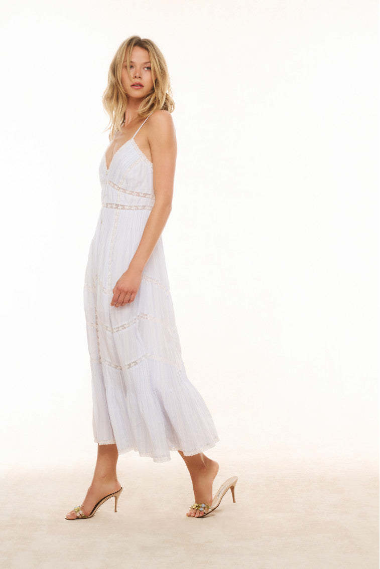 Our Esilda Dress returns as part of our Upcycled Icons Collection. a limited-edition. sustainable capsule featuring our best-selling silhouettes made from remnant OhMollys fabrics. The piece begins with spaghetti straps above a v-neckline that sits above a fitted waist yoke that descends to a center front placket with buttons. This piece has a smoked back for easy and comfortable wear.