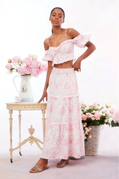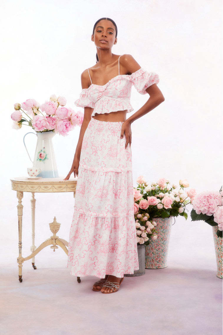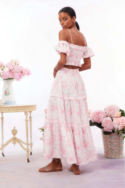 Introducing the Evera Skirt. This sweet maxi arrives with a crisp. linen fabric featuring our signature Fairytale Toile print of a pink winding bow. The must-have. midi skirt features a three-tiered sweeping skirt.