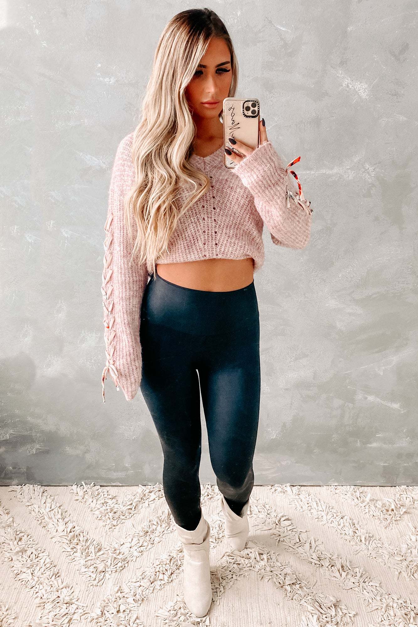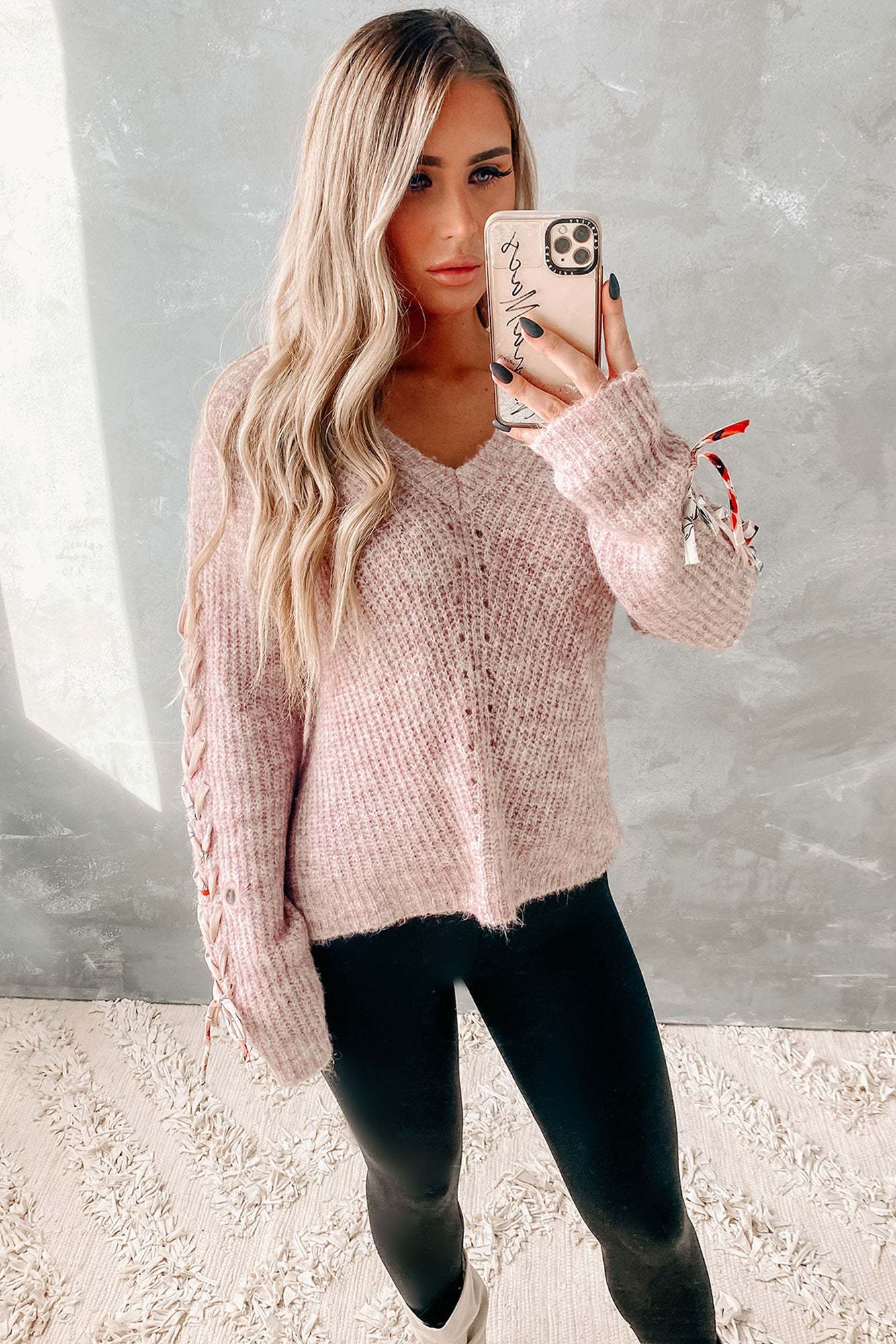 Everyone Will Ask Where You Got This Dusty Rose. V-Neck. Lace-Up Sleeve Sweater!