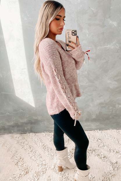 Everlasting Memories Lace-Up Sleeve Sweater (Dusty Rose)