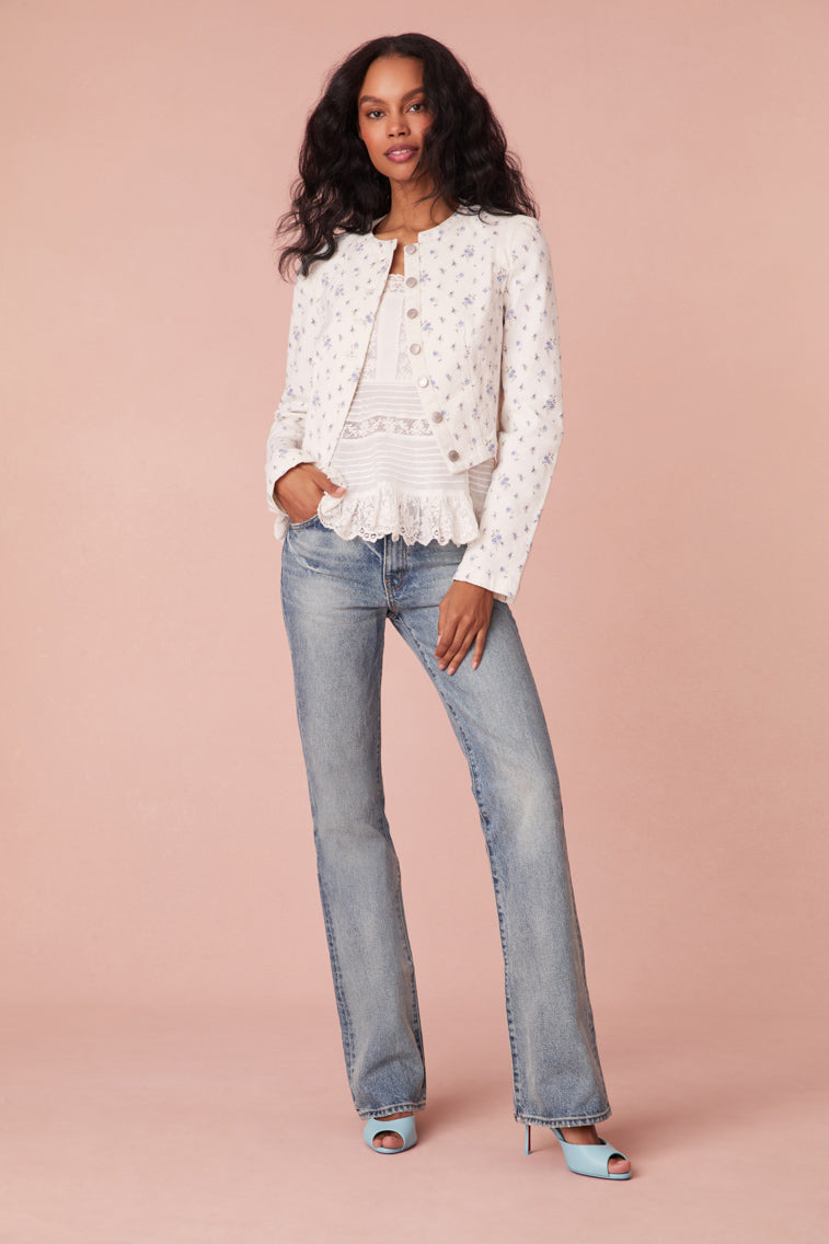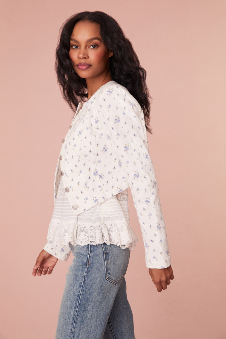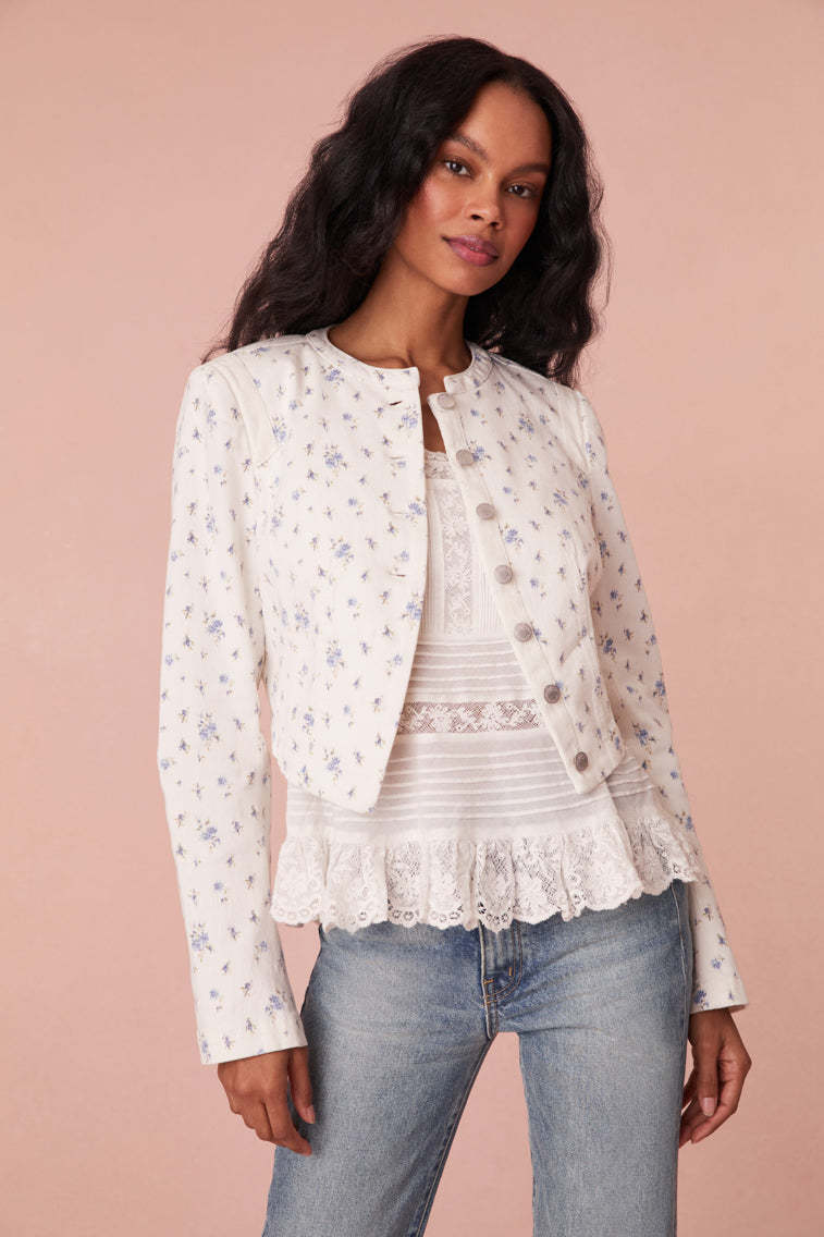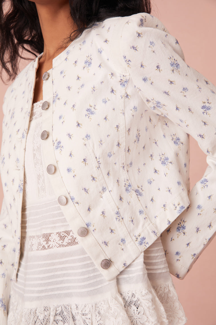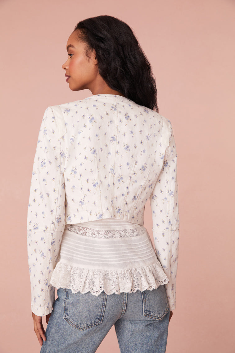 Introducing the Falima Jacket. A must-have of the season. this cropped. white denim jacket features our pocono ikat floral print inspired by a ditsy floral sourced from vintage ribbons in London. With a cool and edgy silhouette. the playful jacket includes a cut-out detail on the front and our custom logo buttons. Pair with your favorite mini skirt for a full look.