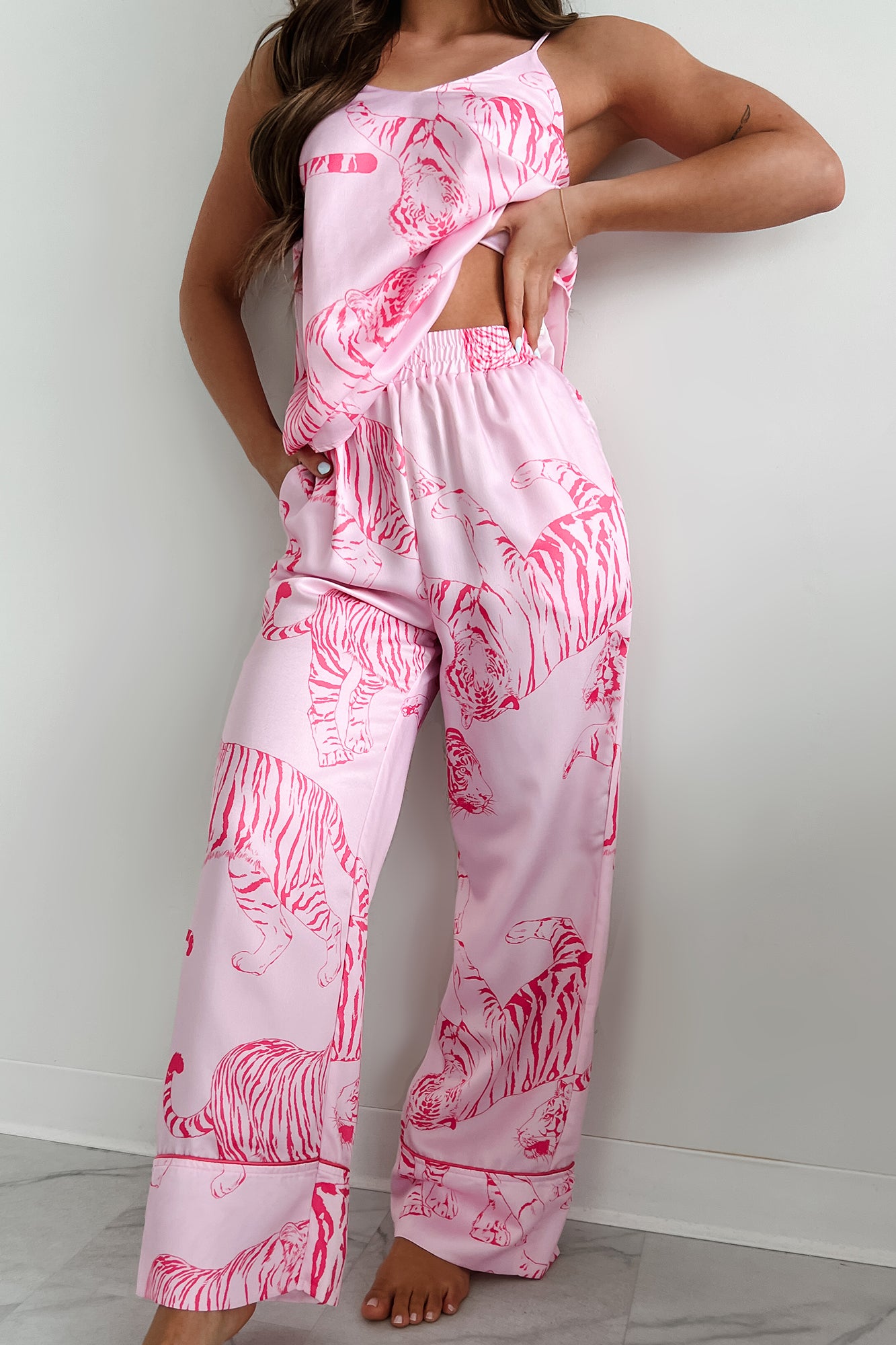 Feeling Catty Tiger Print Satin Pajama Set (Pink)