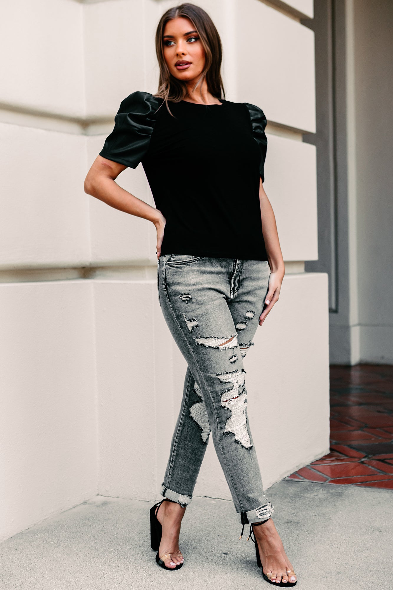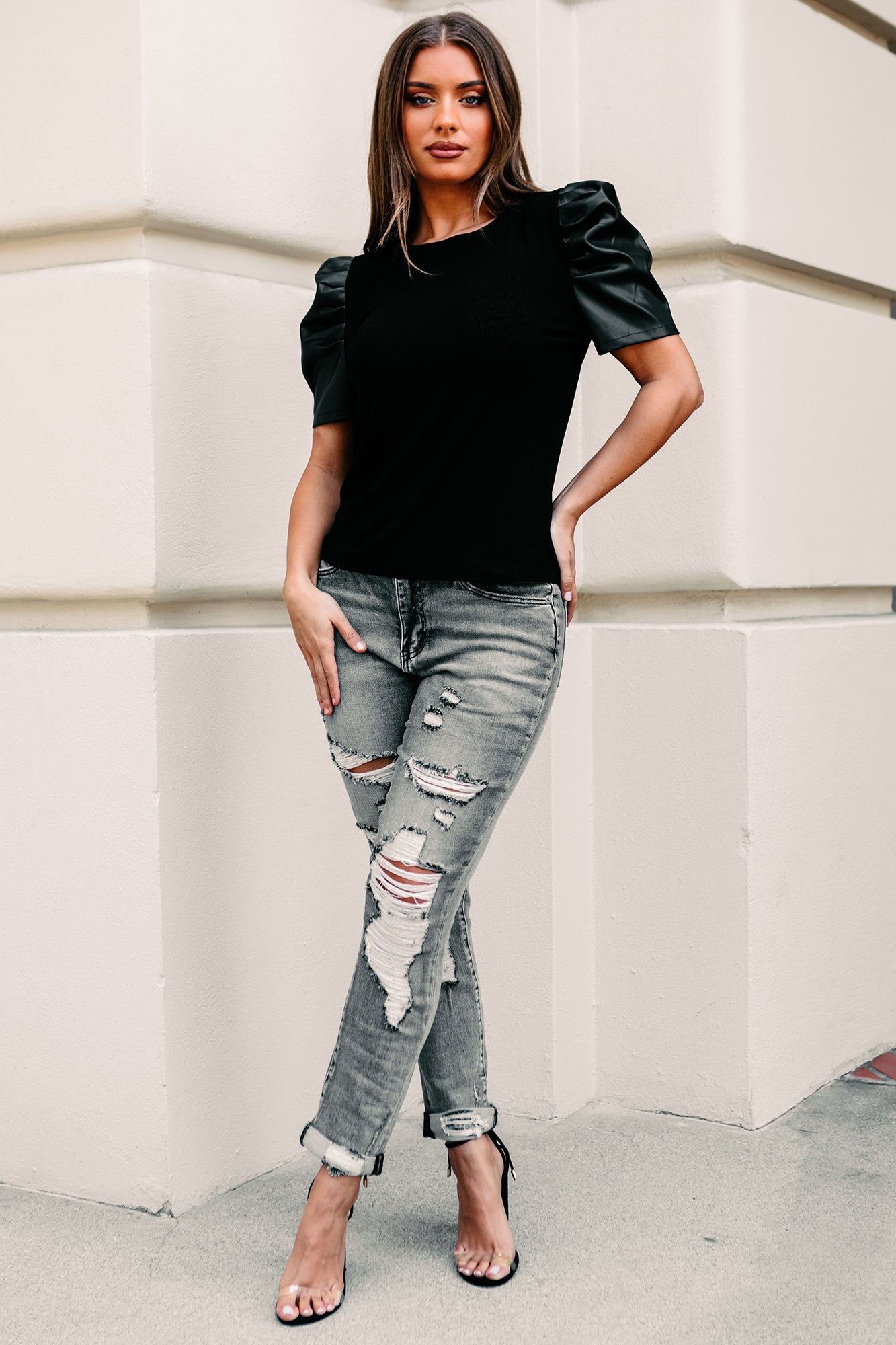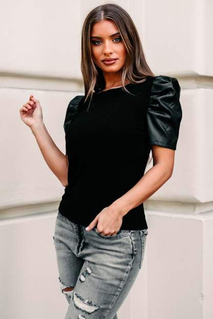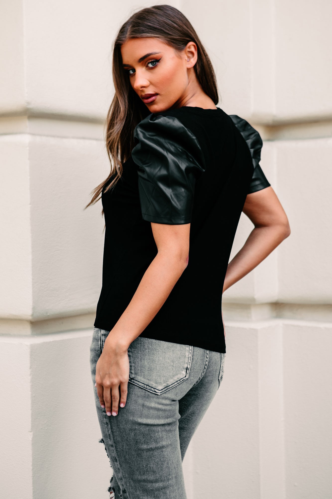 Stand Out In This Black. Faux Leather Sleeve Top! The Puff Sleeve Is So Fun While The Faux Leather Material Gives It The Edge You've Been Looking For!