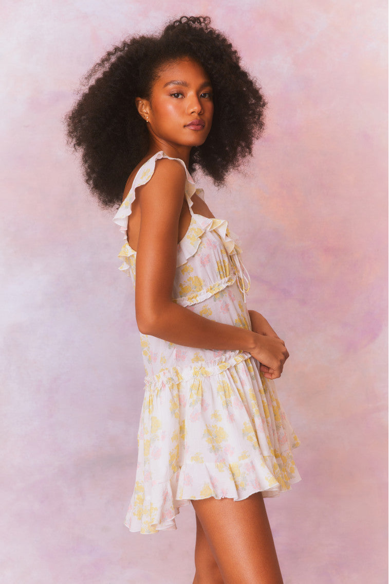 Channeling sunshine in the Frista Dress. This playful mini debuts with a cotton voile and a pretty mixed print featuring pastel florals all over. Beginning with flutter straps. the dress has ruffles lining the neckline. tiny tie details at the front and a slightly dropped waist for a flattering silhouette.