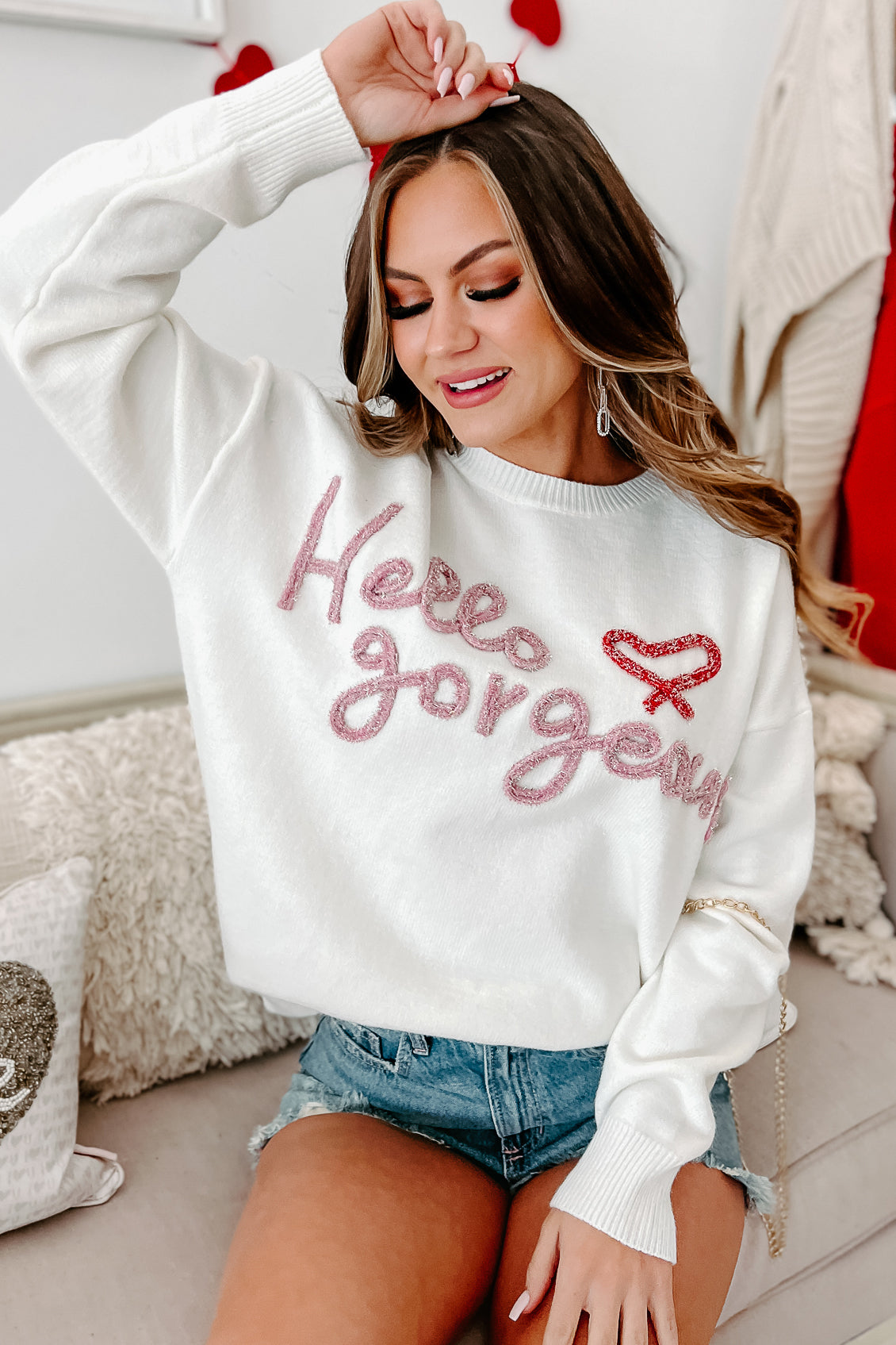 LET YOUR INNER ROMANTIC SHINE THROUGH WITH THIS COZY. CASUAL LOOK! THIS V-NECK NUMBER FLAUNTS A DREAMY EMBROIDERED HEART PATTERN IN BEAUTIFUL SHADES OF RED. PLUS. ITS COMFY LONG SLEEVES AND RELAXED FIT MAKE IT A MUST FOR EASY EVERYDAY WEAR!