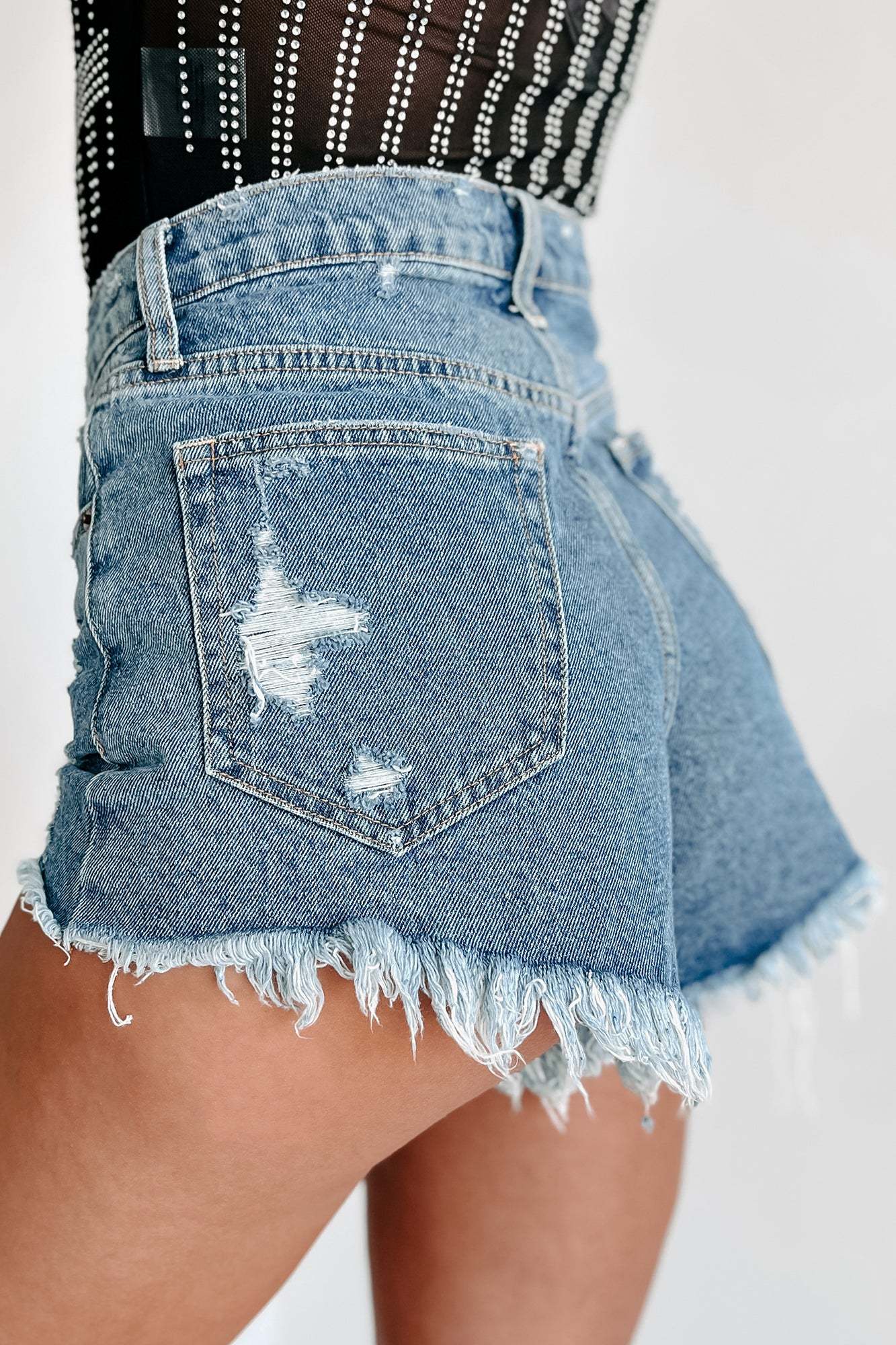 Indy High Rise Distressed Cello Shorts (Medium Denim)