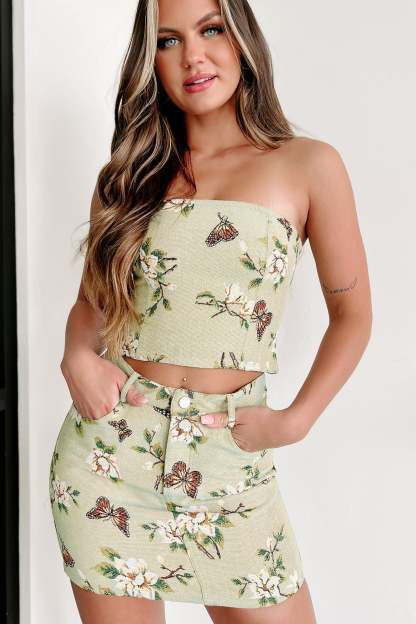 Into Your Garden Butterfly & Floral Print Two Piece Skirt Set (Green)