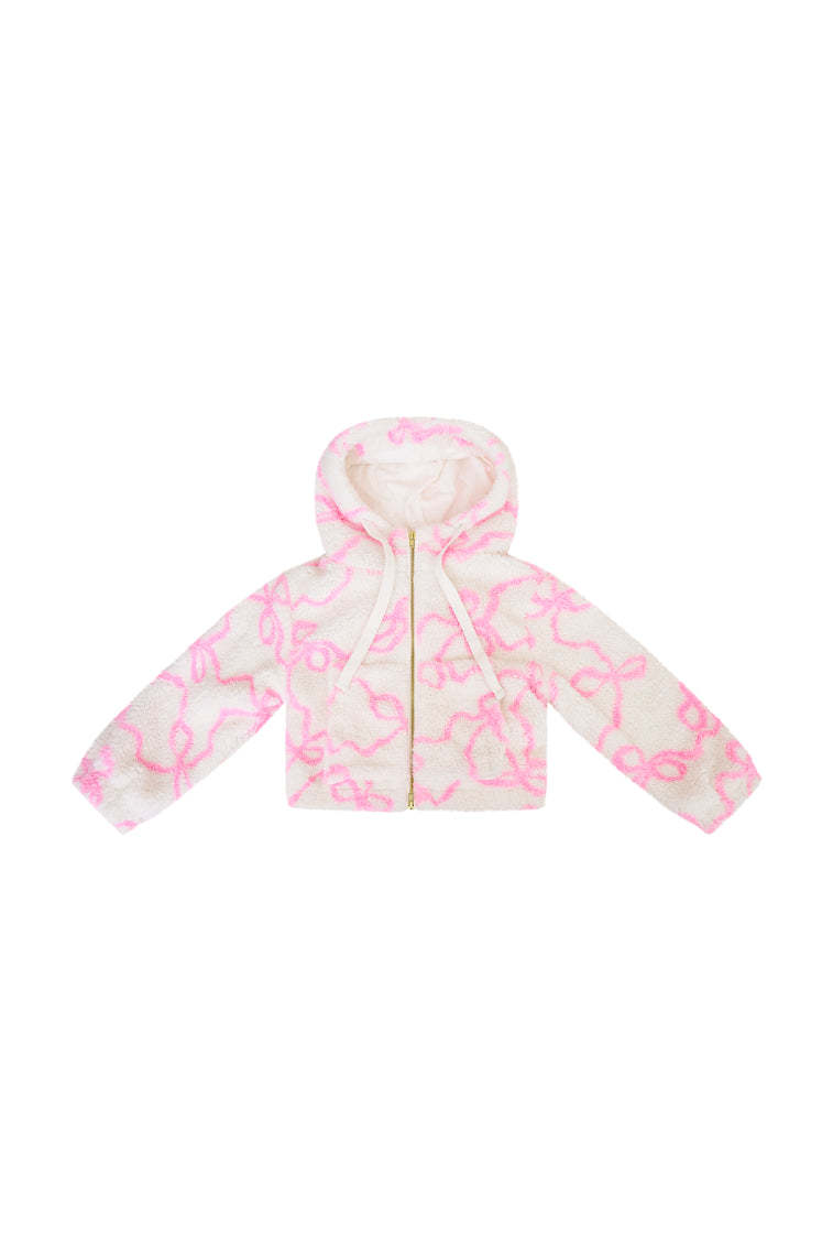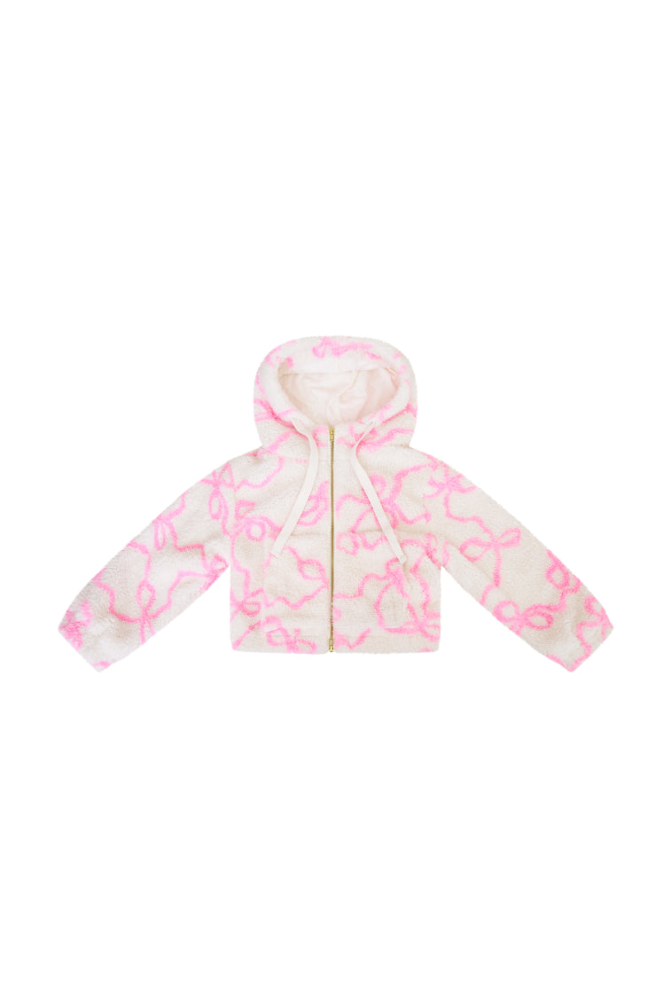 Our minis keep it warm and cute in the Jacquel Bomber. This must-have fleece outerwear features our signature winding bow print all over. a hood. drawcords. center front zipper. and pockets.