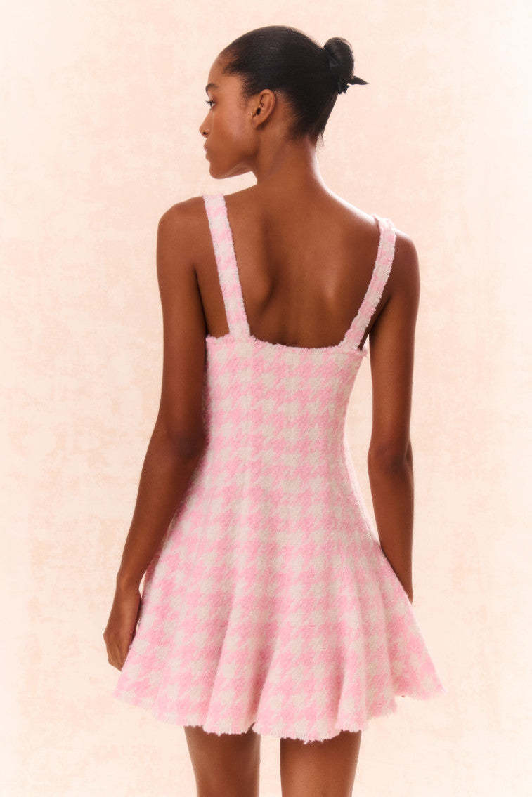 Introducing the Josalie Dress. This preppy mini is designed from a houndstooth tweed fabric with a shimmering lurex thread throughout giving it a New York City-inspired look with a LoveShack touch. This sweepy mini stuns with a flattering silhouette featuring princess seams that descend into godets. cups at the bust. fraying detail around the neckline. and a flirty sweep.