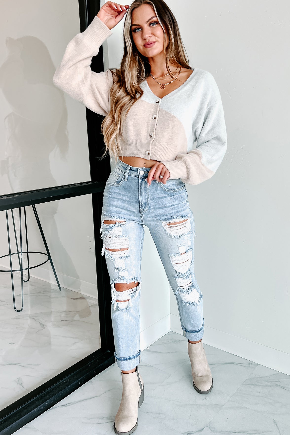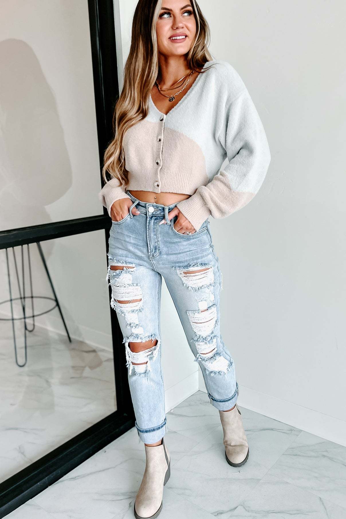 This Patterned. Two Tone Cardigan Is Cute And Will Pair Well With Any Jeans In Your Closet!