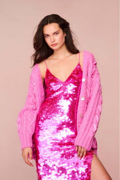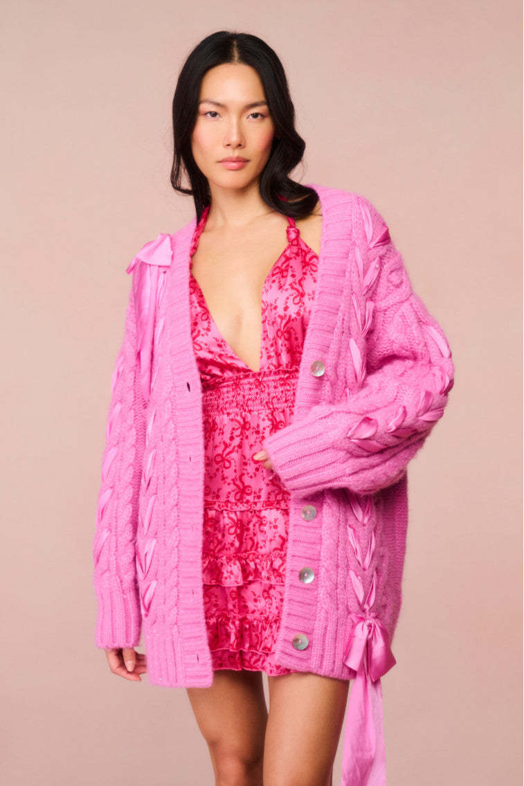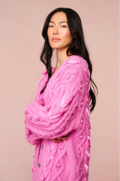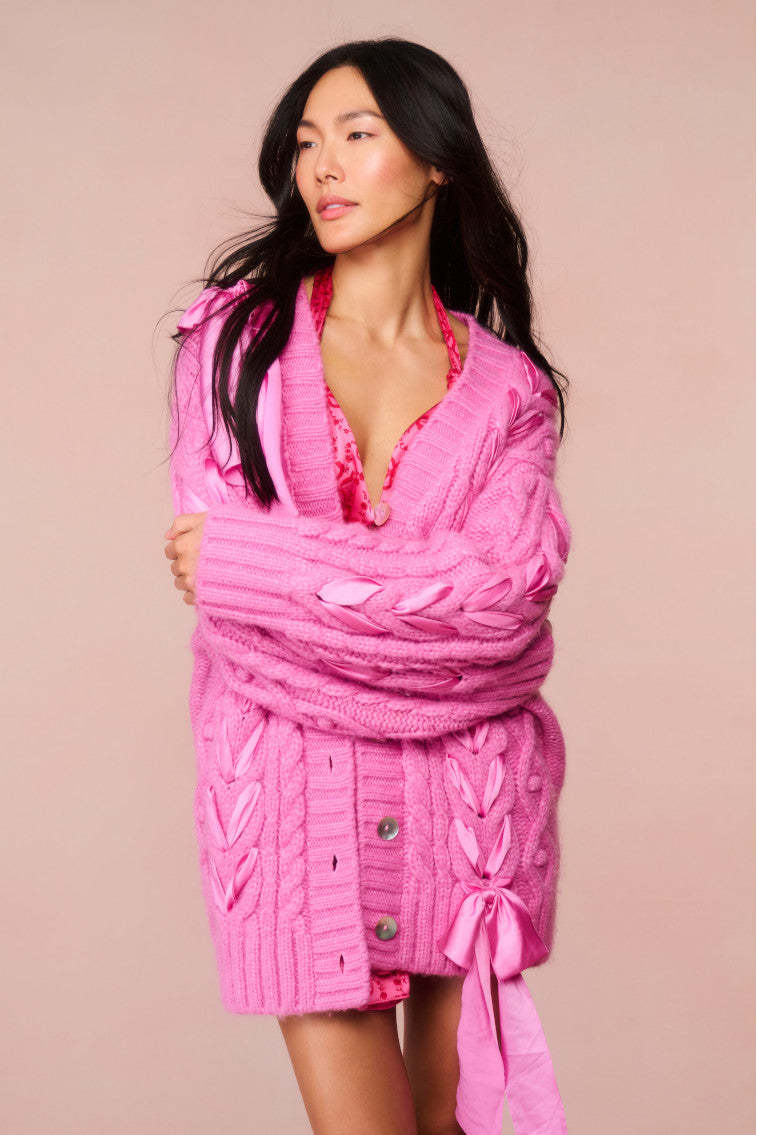 Living in the Kassius Cardigan. This sweater arrives with a trending boyfriend fit to keep you cozy and cute all winter long. The cardigan is designed from a cashmere wool blend with chunky Peruvian cable detailing and a beautiful charmeuse ribbon threaded throughout that ties into a sweet bow.