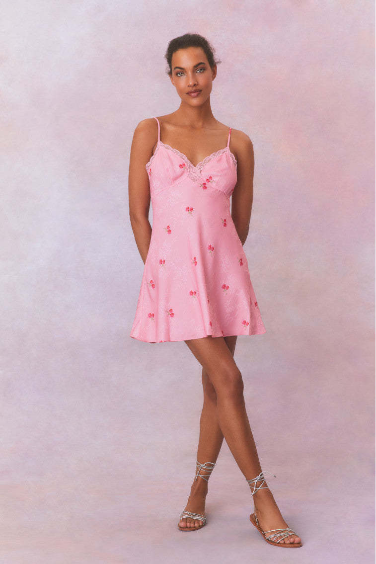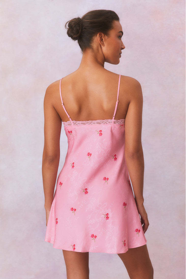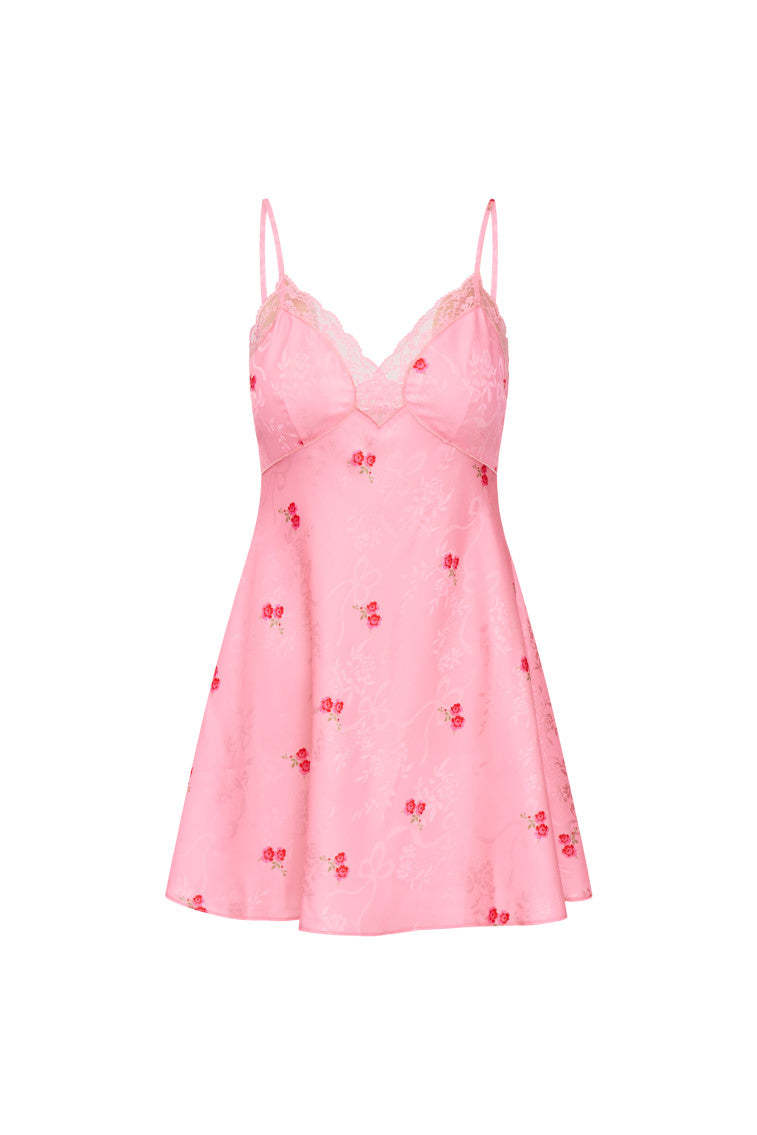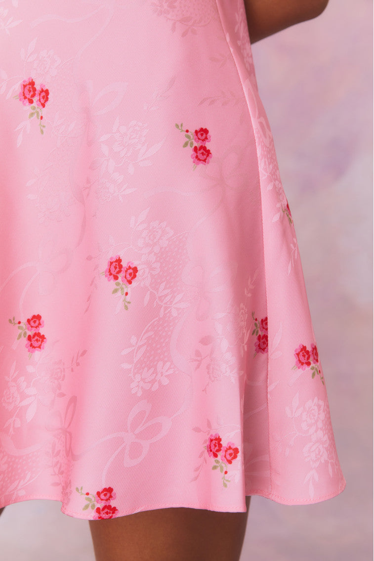 Loving on the Larinda Dress. Crafted from luxurious silky jacquard fabric. this bias-cut A-line mini dress features a playful cut out detail at the neckline. The flirty mini has an open waist design. complemented by an easy circle skirt that drapes effortlessly. Adjustable spaghetti straps ensure a perfect fit. while the pull-on style eliminates the need for a zipper. enhancing comfort and ease of wear. Adorned with a winding bow and delicate ditsy rose print. each dress comes with a separate bow accessory that adds a touch of whimsy.